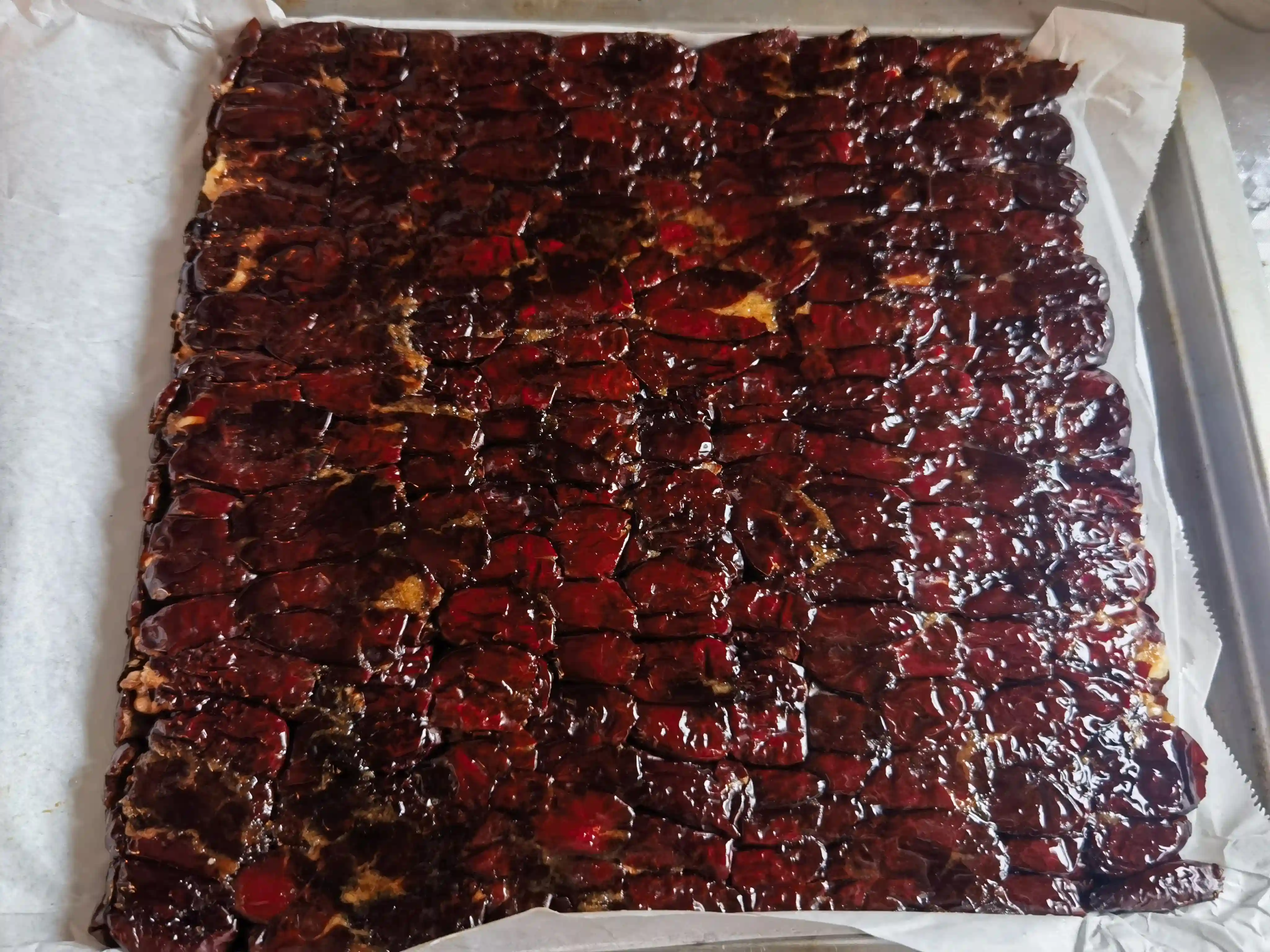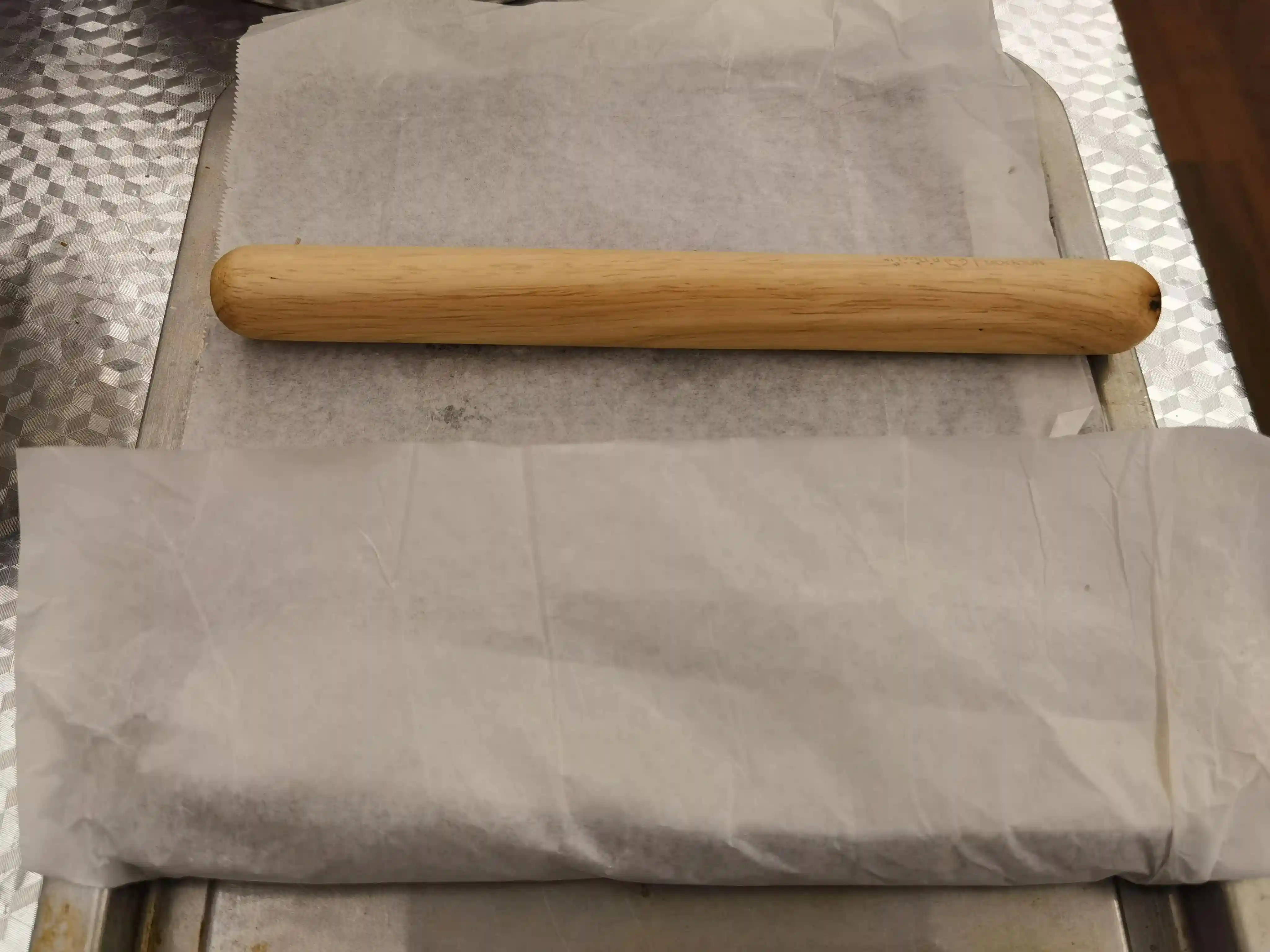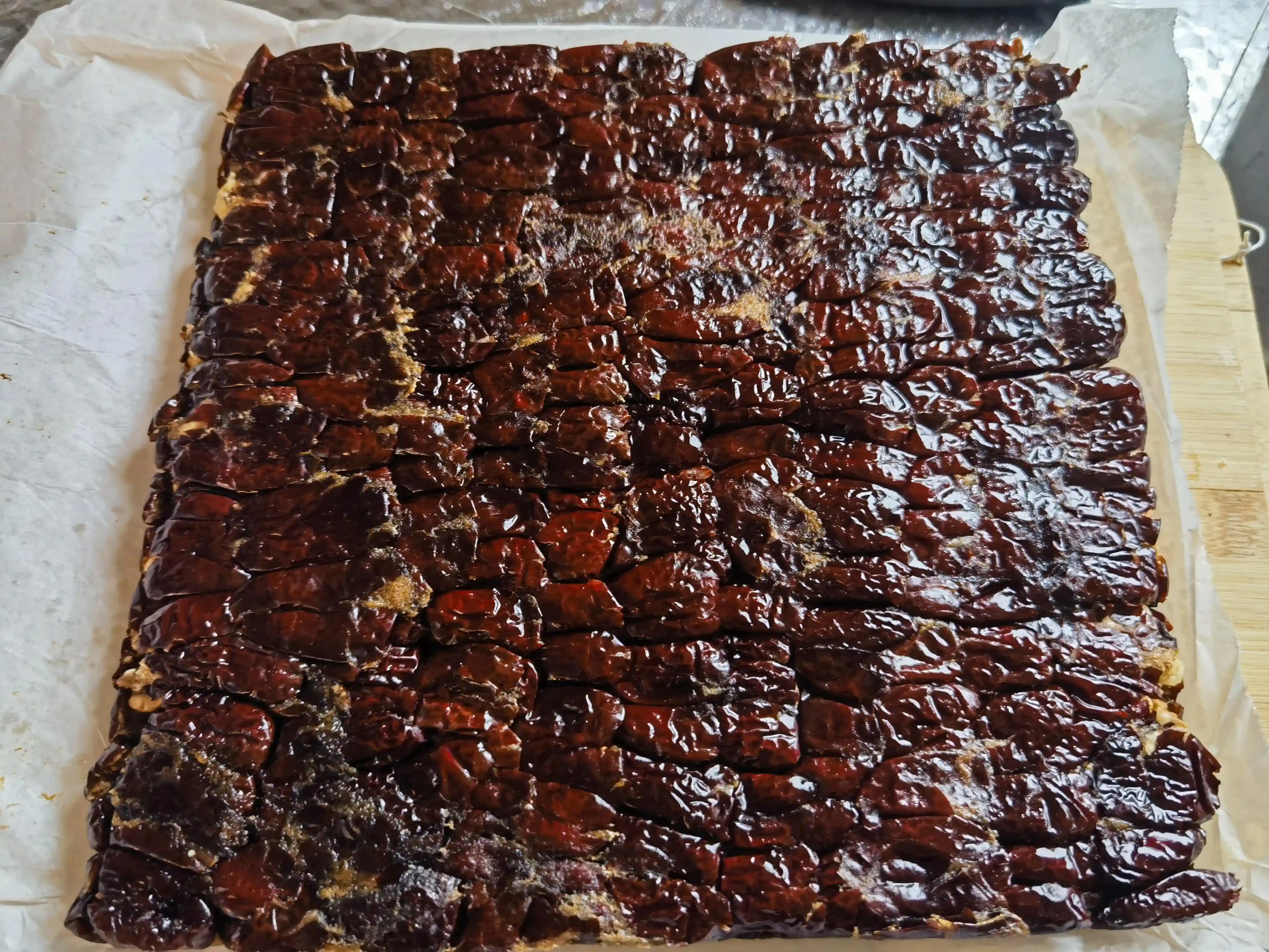 5、压实:在红枣上铺一张油纸,用擀面杖擀压,压实实的。