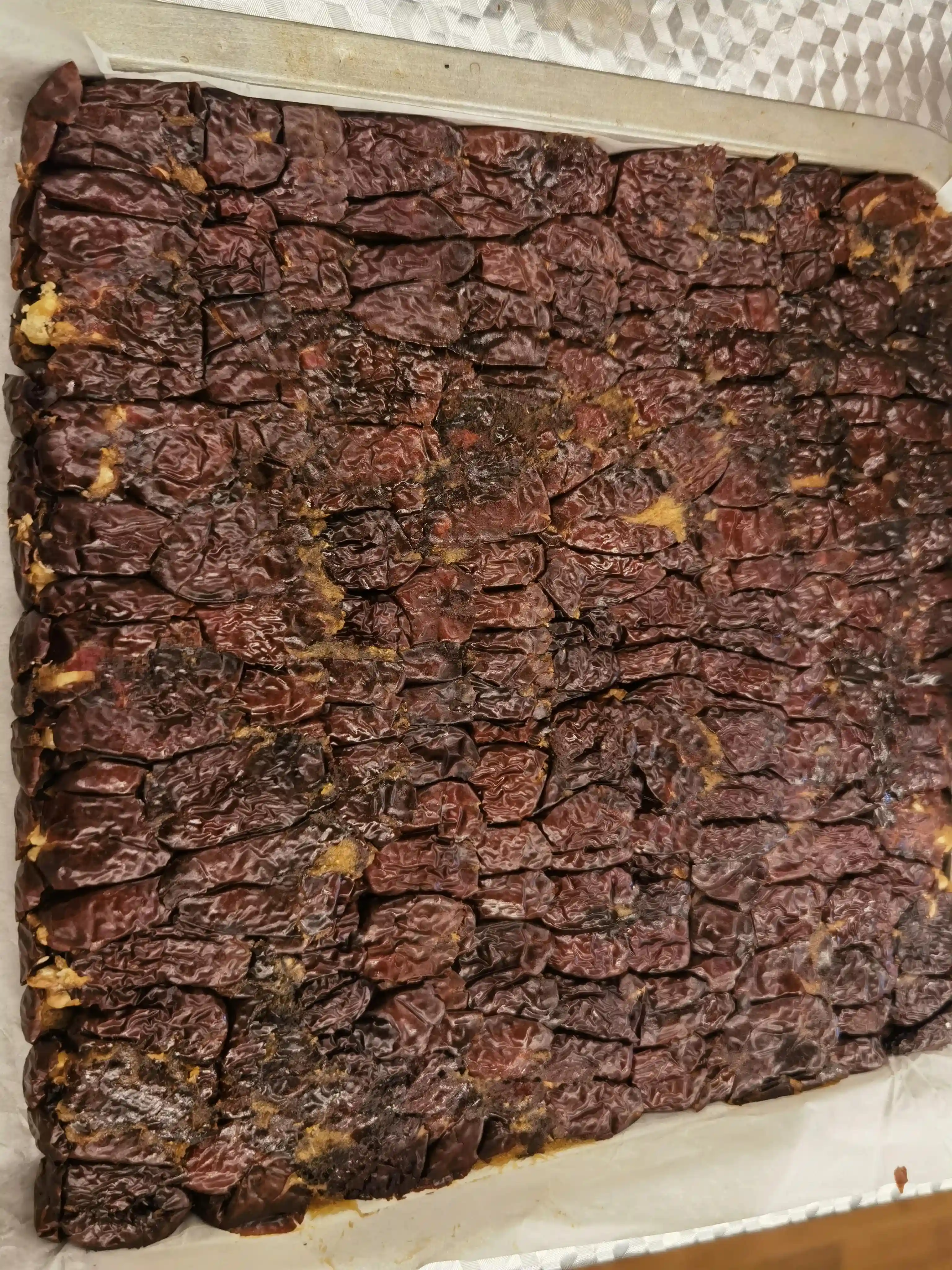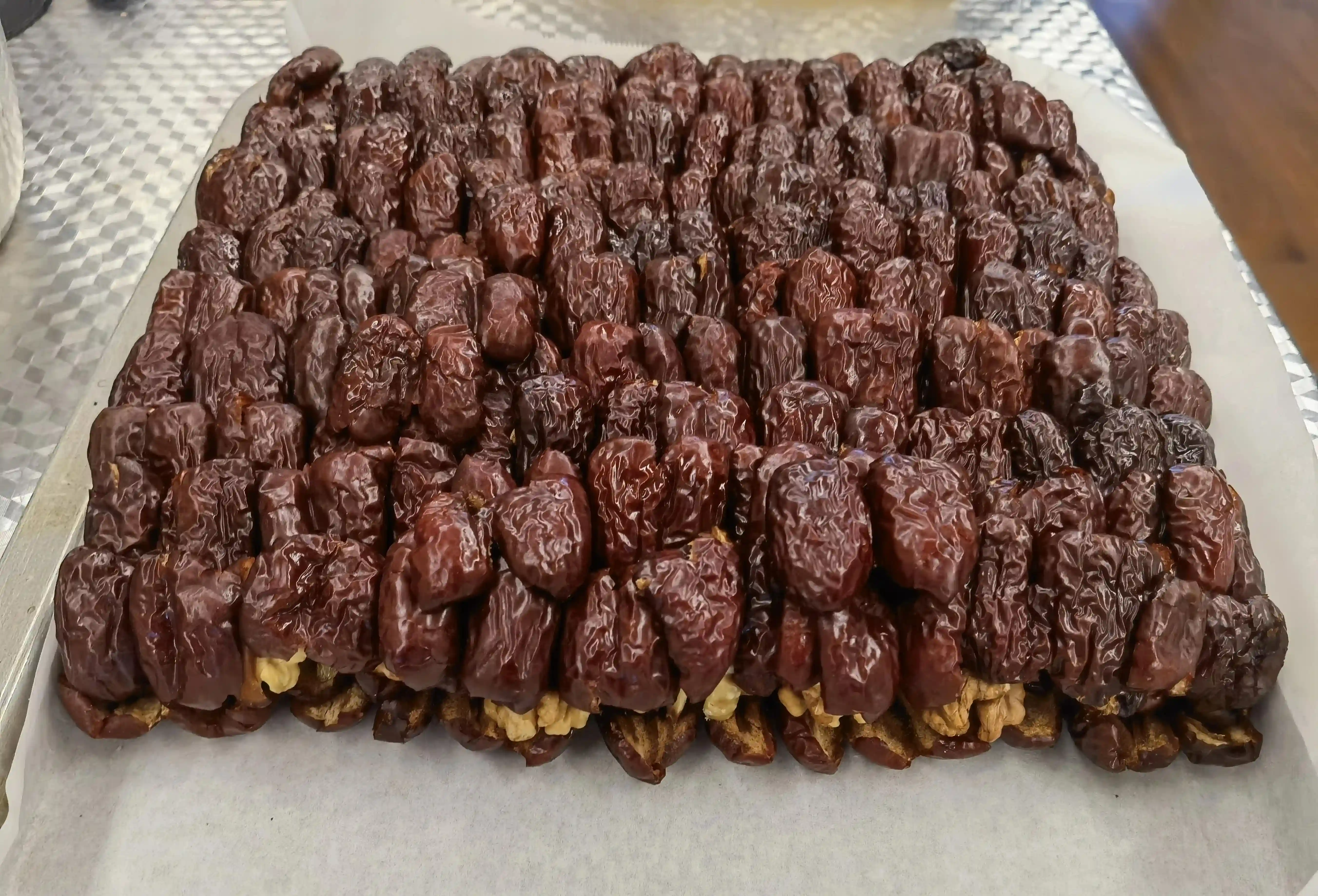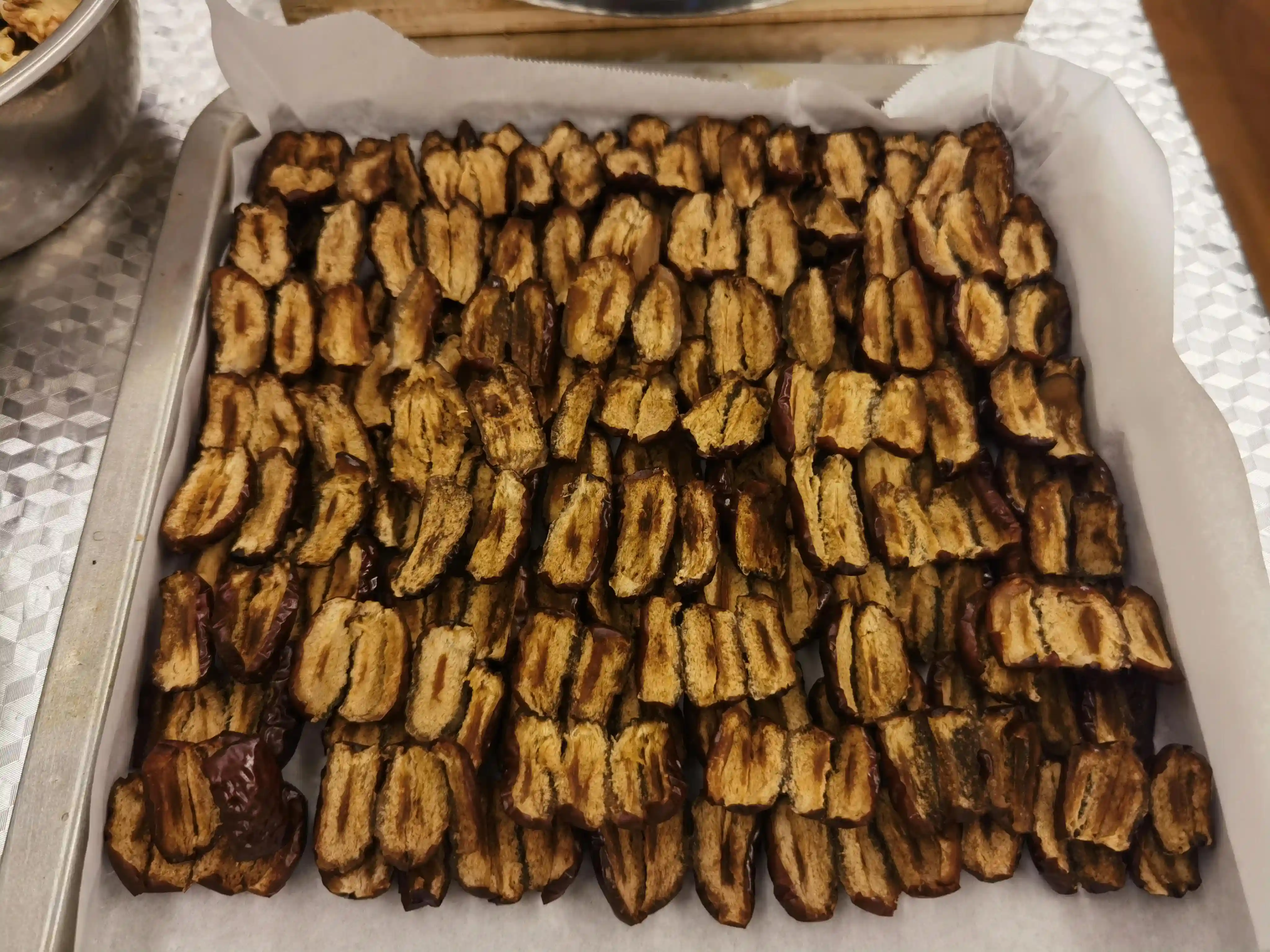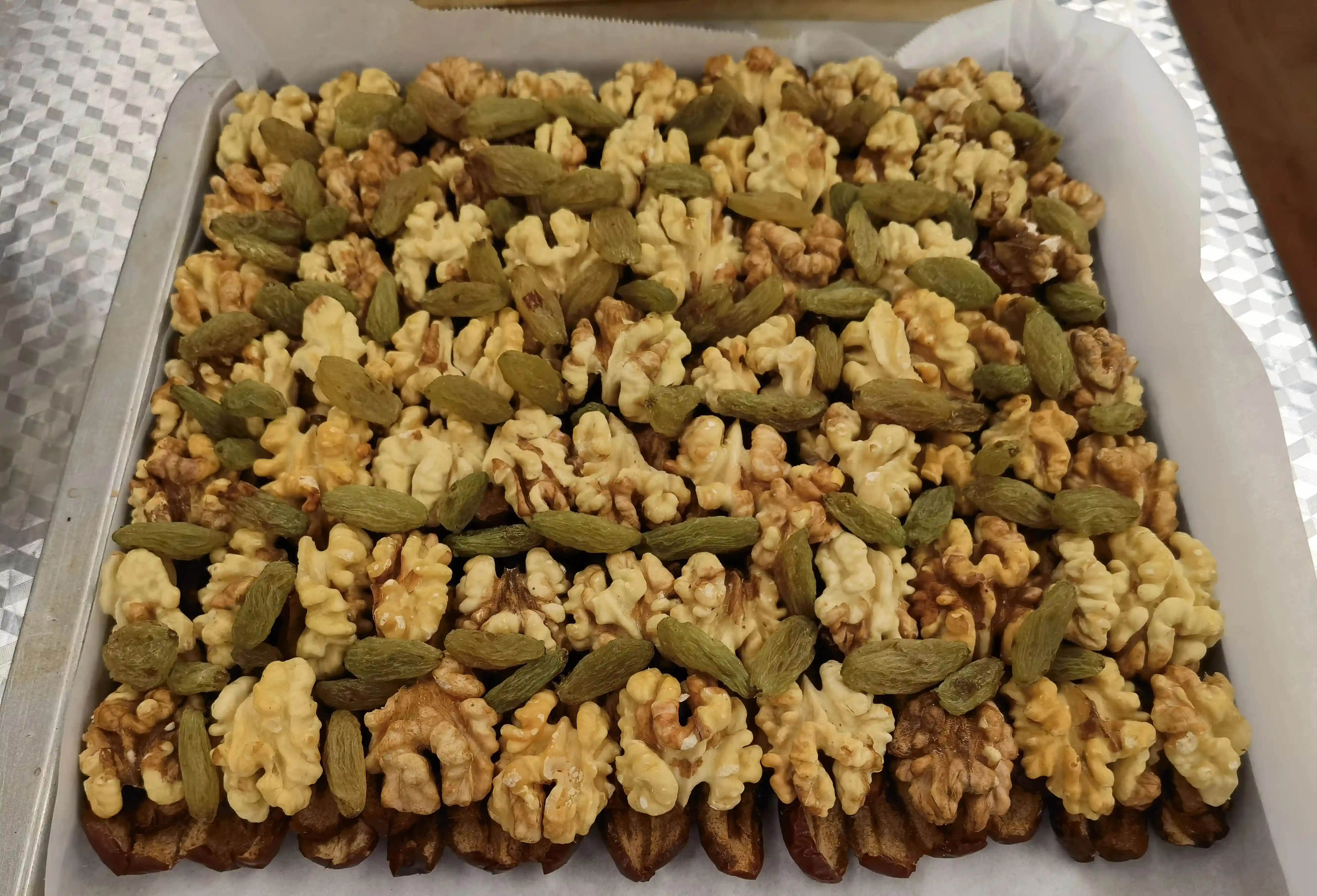 4、摆盘:把烤盘铺上油纸,摆红枣,我看红枣多,摆了二层,也可以一层,上面再摆核桃仁,再放葡萄干,上面再摆红枣。