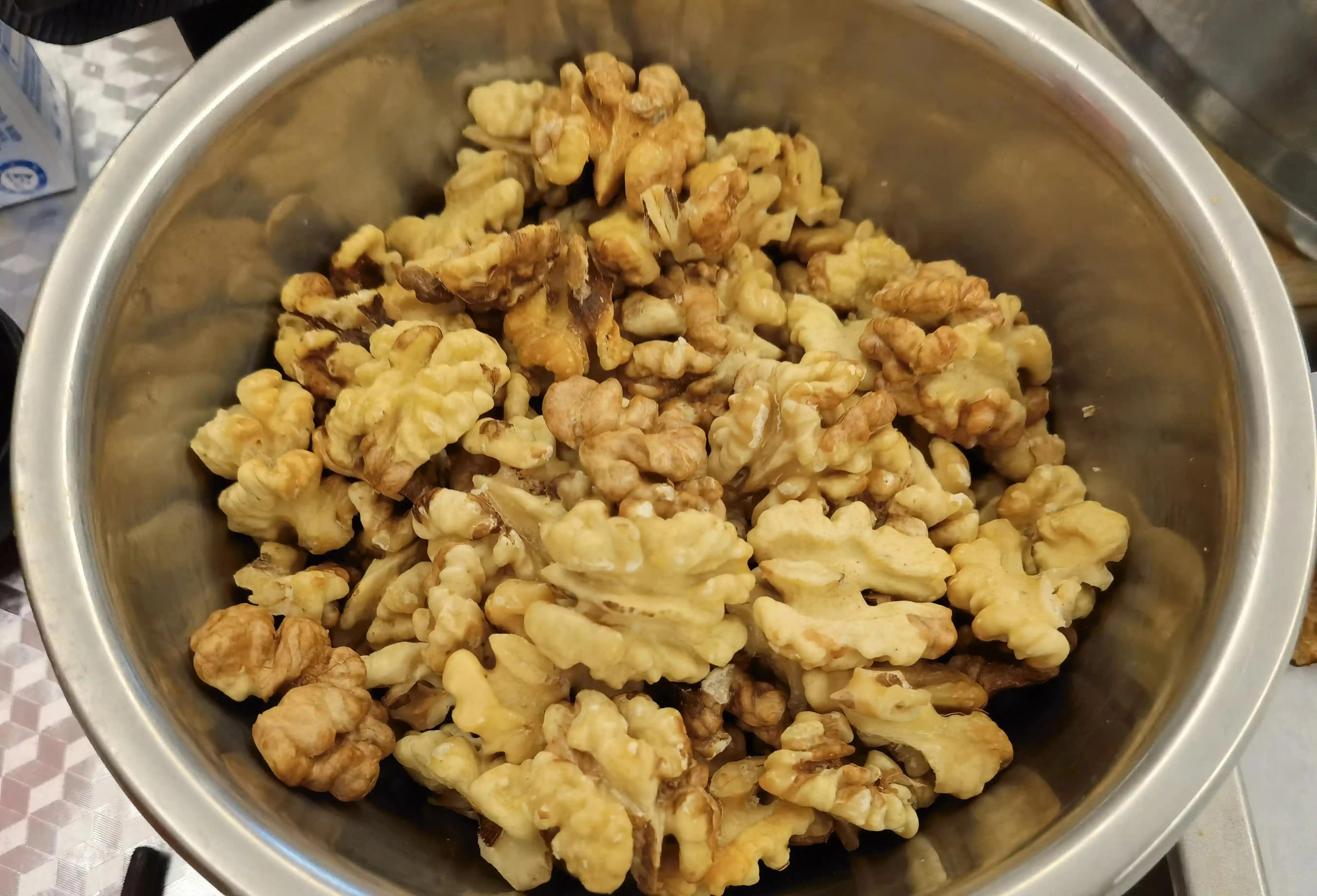 1、烤核桃仁:烤箱上下火180度,烤14分钟,中间取出拌一下,让核桃仁受热均匀,要烤好时有叭叭炸响声,烤熟的核桃仁显浅黄色,取出放凉,去皮,也可以不去皮,皮用手一搓就掉了。