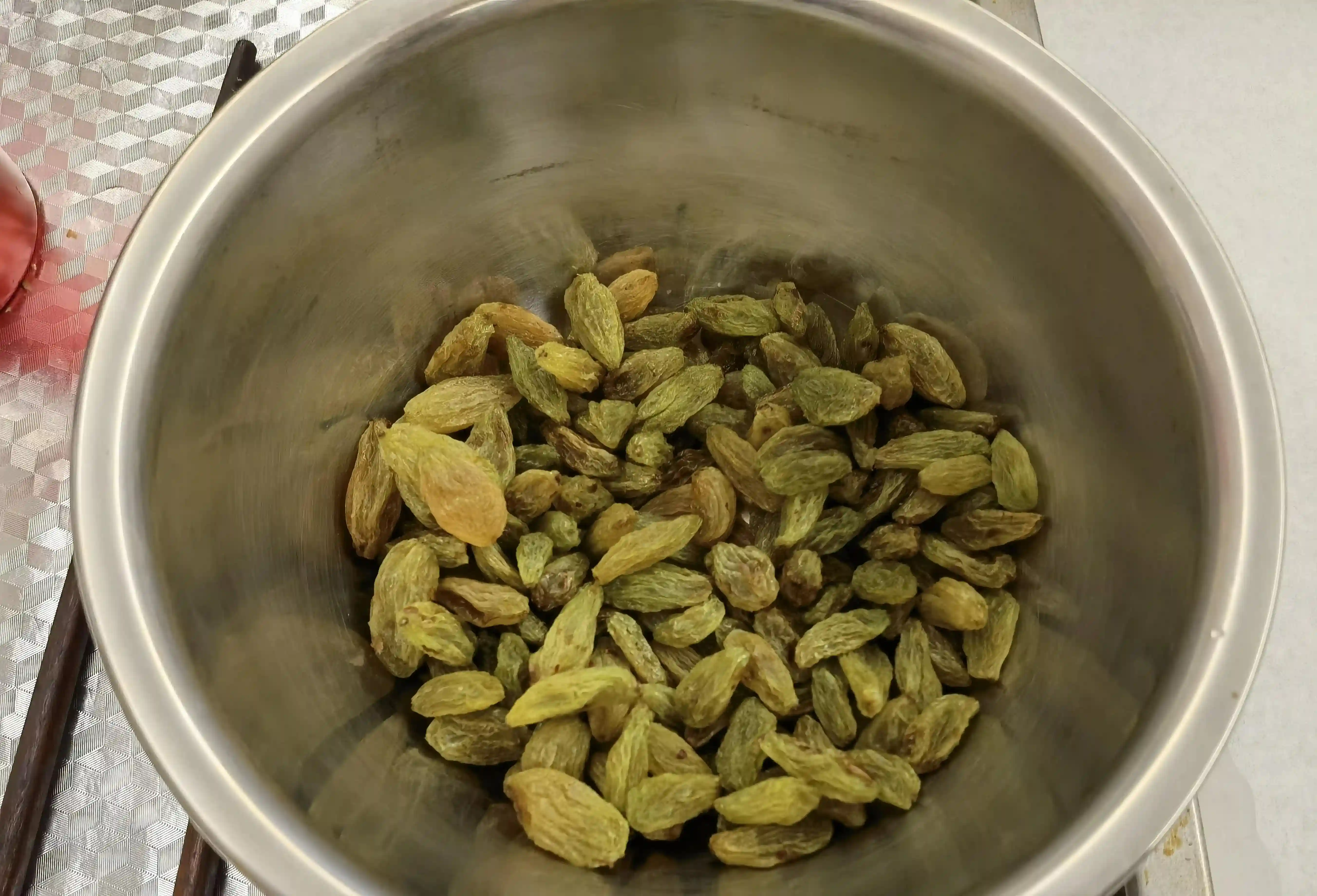 2、洗葡萄干:抓一把葡萄干,湿水洗净,用厨房用纸吸干水份。
