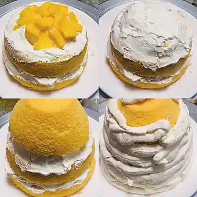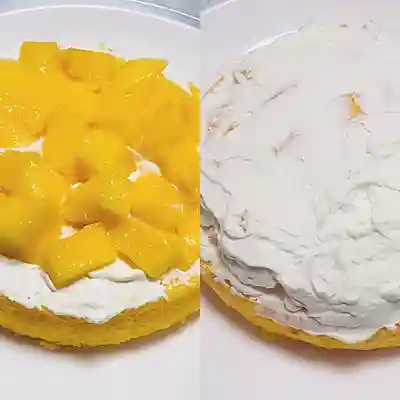 4、蛋糕坯最大的一块放在最底下,先抹一次薄的淡奶油,加上芒果粒,再抹一层薄薄的淡奶油;接着放蛋糕坯中间那块,抹上奶油加芒果粒加奶油;