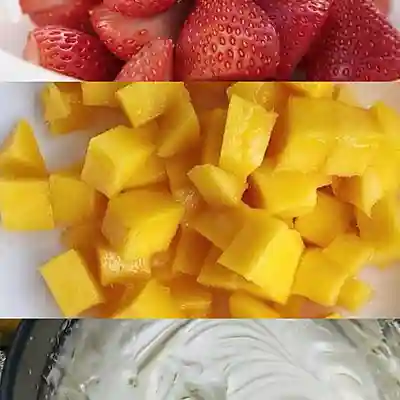 2、草莓洗干净去蒂对半切好;芒果去皮切粒放冰箱冷藏备用;接着350克淡奶油+30克细砂糖打发好备用;