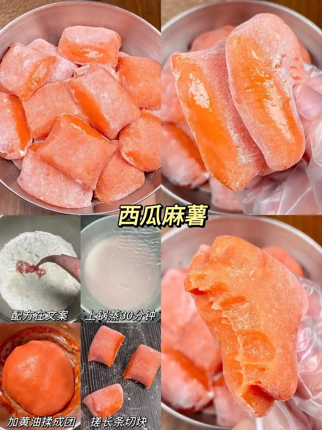食材:西瓜100克,清水100克,糯米粉120克,糖20克