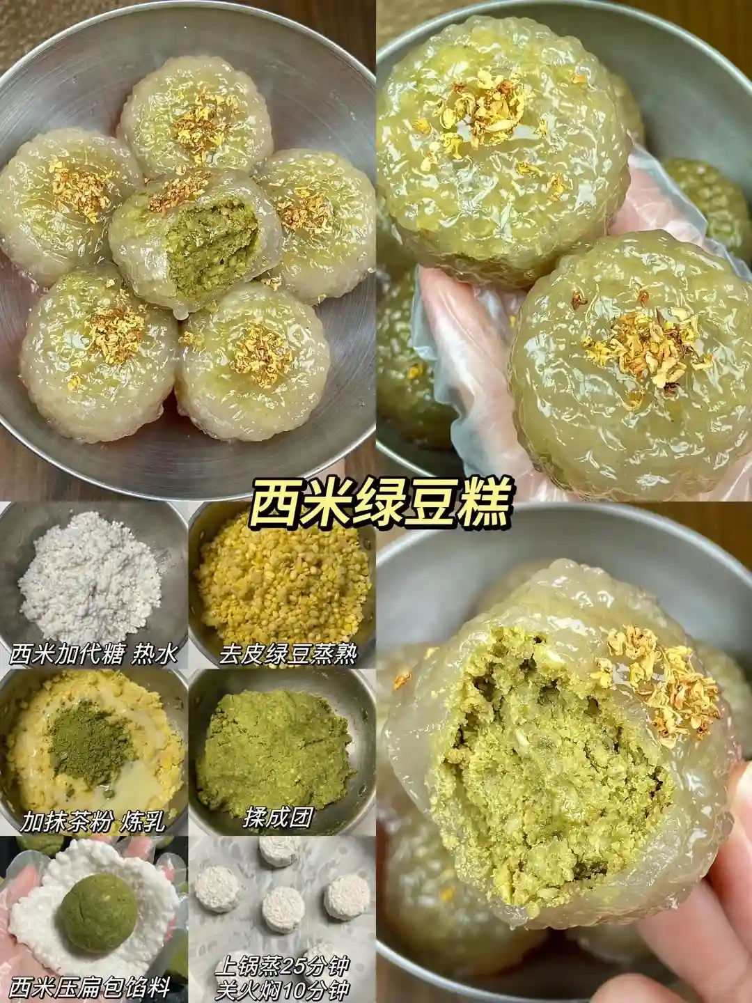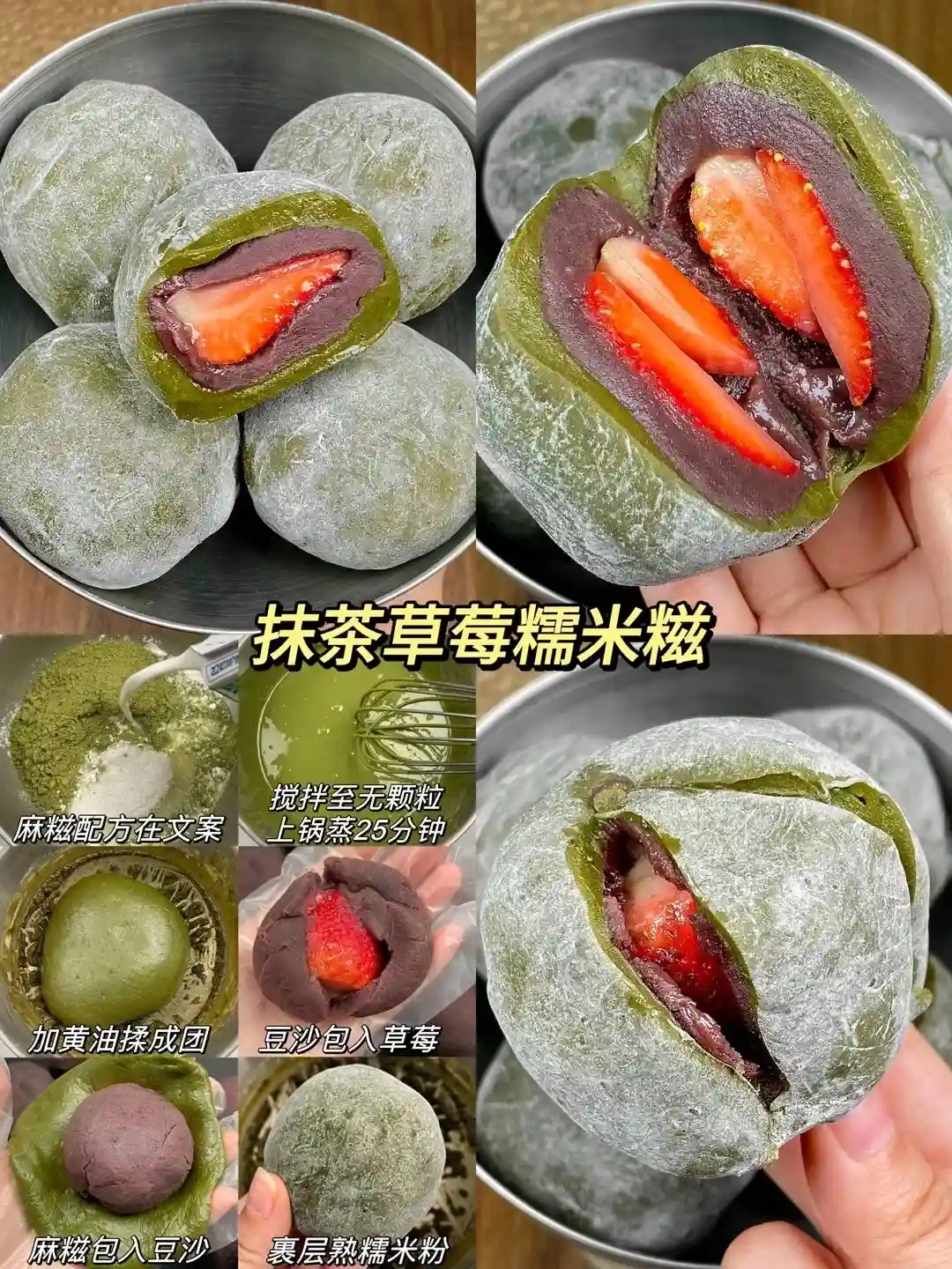 做法:110g糯米饭+30g玉米淀、50g代糖、30g抹茶粉、180g牛奶,搅拌至无颗粒,上锅蒸25分钟2蒸好加15g黄油,揉成光滑面团,红豆沙包入草莓,麻糍包入红豆沙,外面裹层熟糯米粉即可