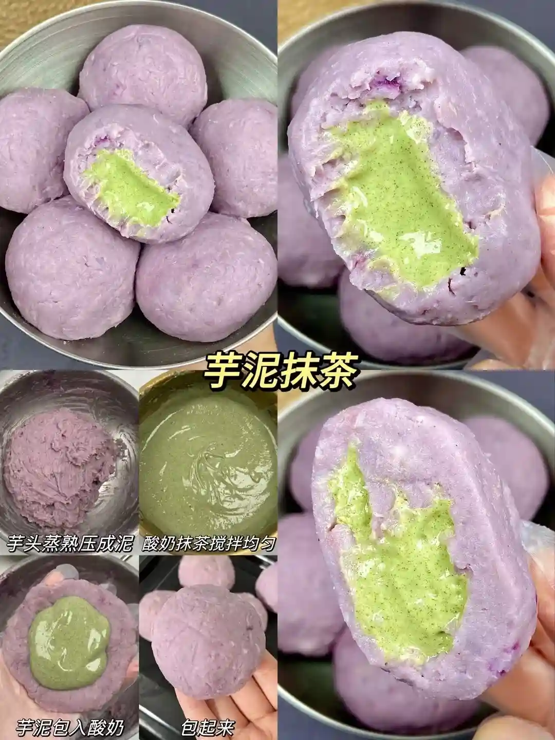 1、芋头蒸熟加牛奶、紫薯粉、代糖压成泥