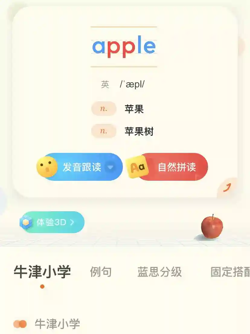 为每个单词录制了自然拼读教程,让小学生与英语母语国家孩子同步学习正宗的发音规律和拼读技巧。在孩子眼里,单词不再是一堆字母的随机拼盘,而是有序的组合,这就大大提高了学习单词的效率。