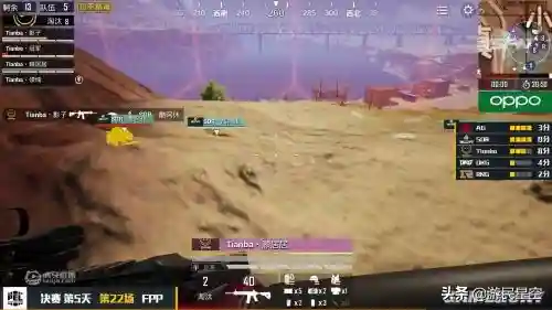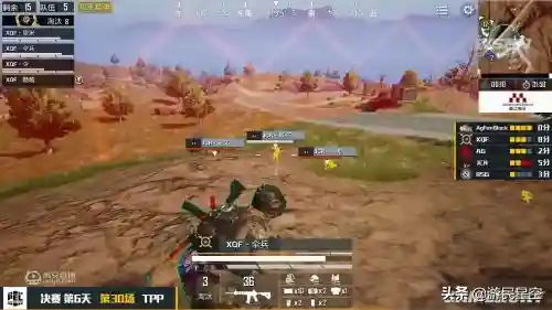 第五场比赛TPP模式沙漠地图,航线从东南部海域至青铜城方向。在决赛第二轮比赛中,发挥始终不稳定的XQF在最后一局展现出了自己不肯放弃的决心。在决赛圈中,XQF占据了高点,在损失一人的情况下,挡住了JCR的猛攻。然后,趁AgFoxBlack与AG混战直击,偷掉AgFoxBlack俩人。XQF·令高抛雷炸倒AgFoxBlack·super,并将588打至残血。高点队友伞兵将588补掉,帮助队伍取得了第1名。