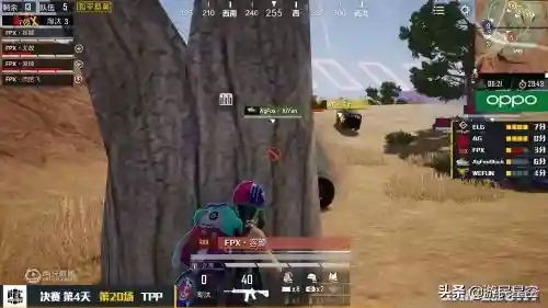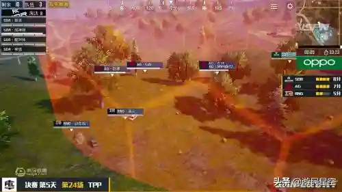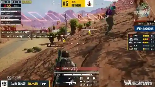 第五场比赛TPP模式沙漠地图,航线从普罗港至火电厂方向。本场决赛圈,孤狼队伍众多,FPX本3人队伍,但在转移过程中遭到了雷王WF·诚C的轰炸,3人全部倒在了诚c精准的投雷技术下。但就在诚c投雷淘汰FPX后,自己也暴露在了ELG的枪线下,被ELG·明皇带走。随后,ELG再清走AgFoxBlack独狼,稳住了局面。ELG、AG满编2v2,AG依靠背坡优势占据很大的优势,击倒了ELG·明皇。如此劣势下,ELG·北斋孤身前压,配合队友干净利索的淘汰2人,此时队友也扶起来明皇,变成了4打2的局面。之后,轻松将AG带走。
