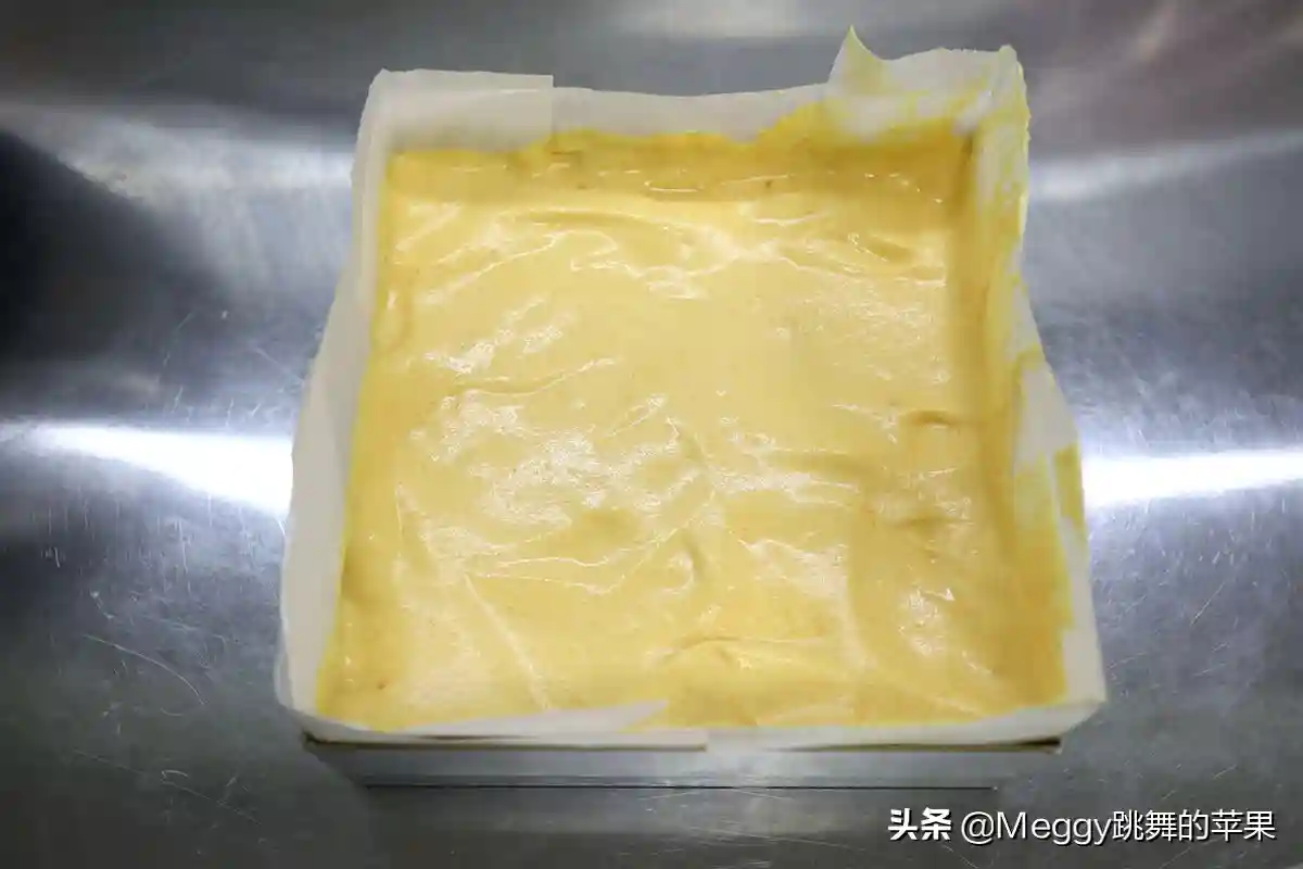 13.将蛋糕糊倒入铺了油纸的8寸方形蛋糕模具中,表面抹平;