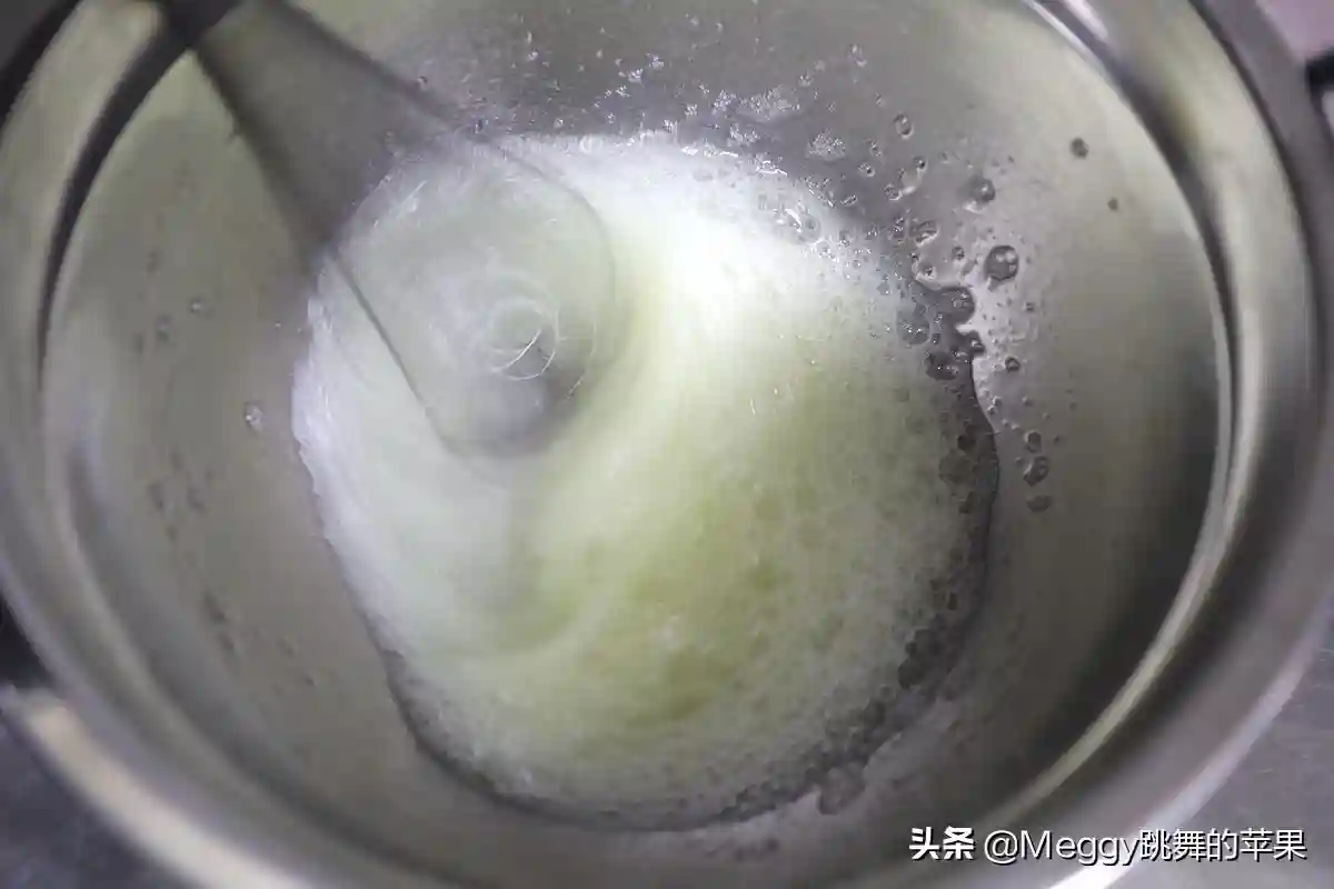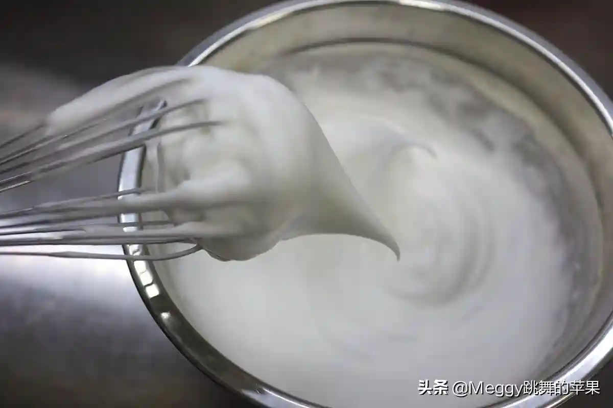 8.蛋清用电动打蛋器中速打出粗泡,细砂糖分3次加入,分别是打出粗泡时、打出白色细腻发泡时、打出有明显纹路的细腻发泡时;第二次加糖后,将打蛋器由中速调整为低速;
