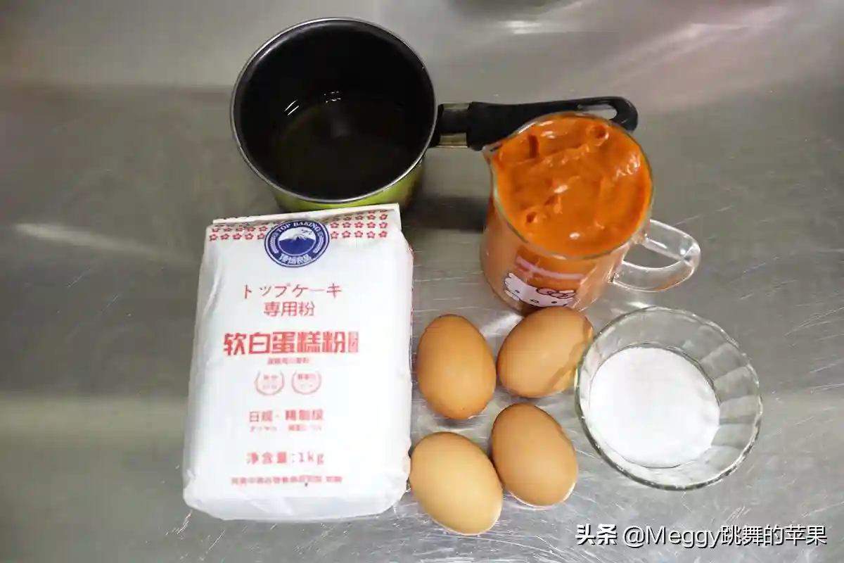 【材料】鸡蛋4个,南瓜糊100克,蛋糕粉80克,玉米油40克,细砂糖40克