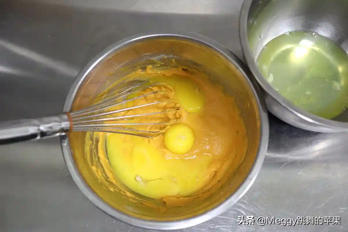 6.蛋清蛋黄分离,蛋黄直接入南瓜面糊中,蛋清入无油无水的打蛋盆中;