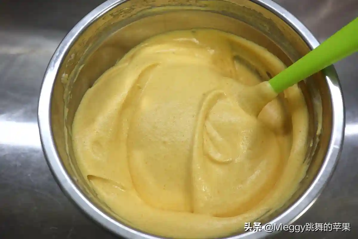 12.用上下翻拌或者切拌的方式混合均匀,呈细腻的南瓜蛋糕糊;