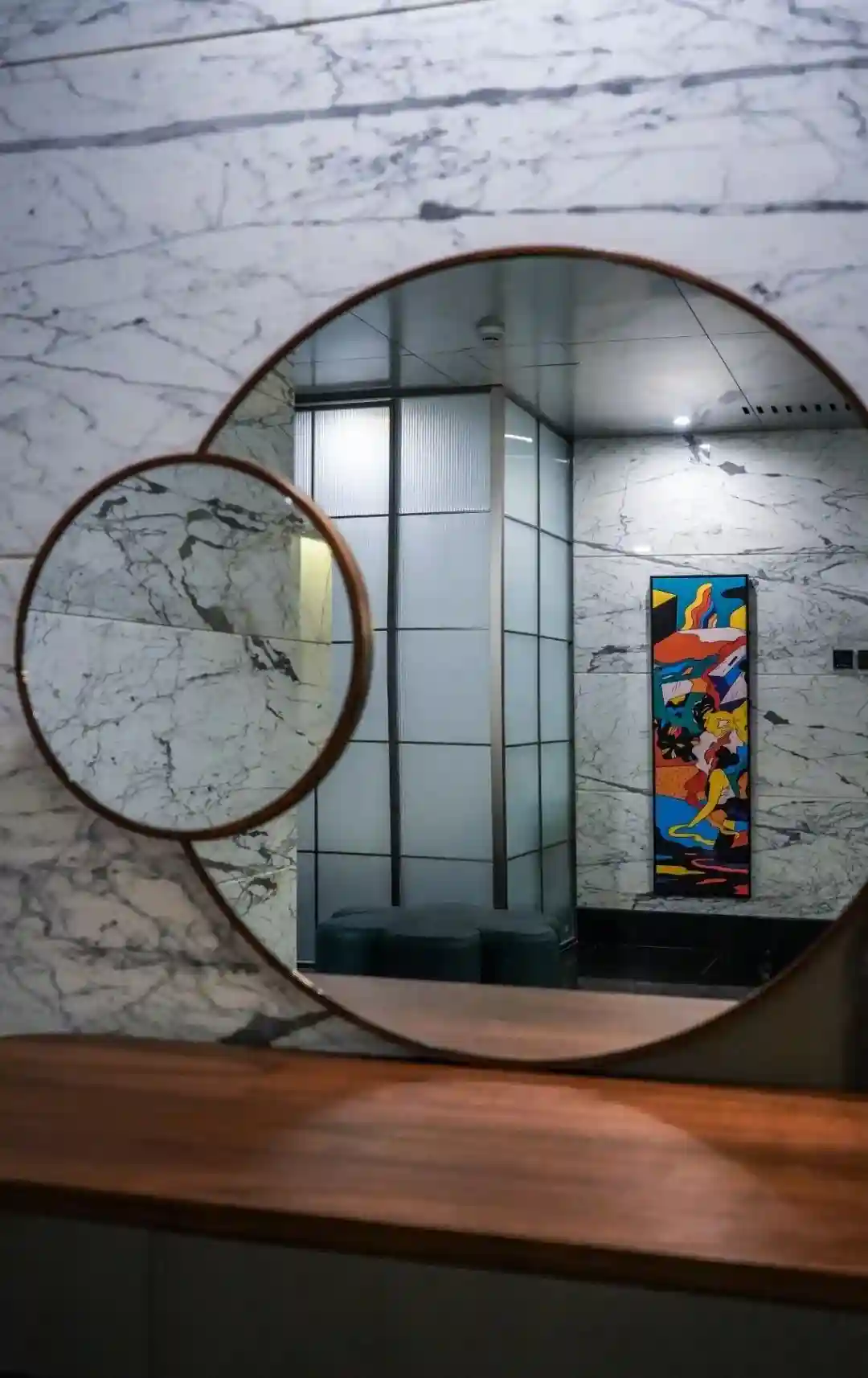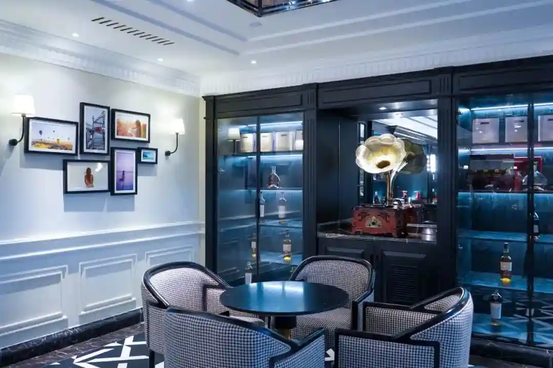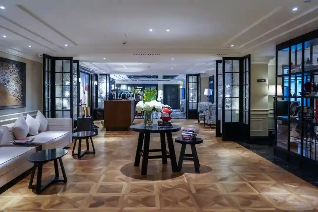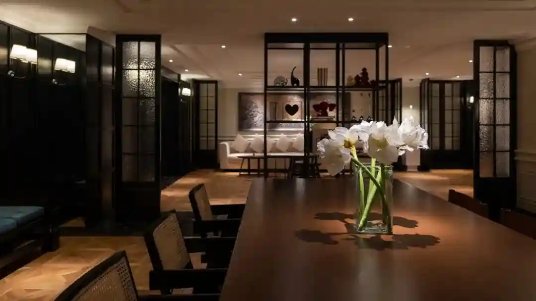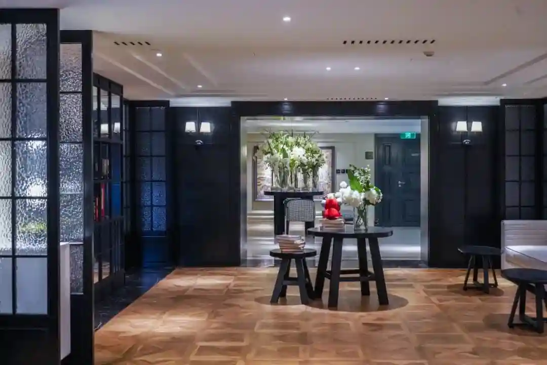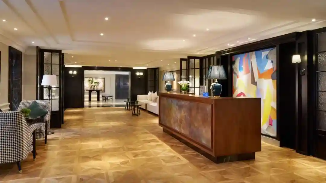 酒店的所有设施都位于2层,传承于建筑外部的气度,内里设计彰显“皇家会馆”这一风范。整体配色,以更突显质感的实木、大理石为基底,数扇玻璃材质的屏风将大堂区分为多个功能分区。