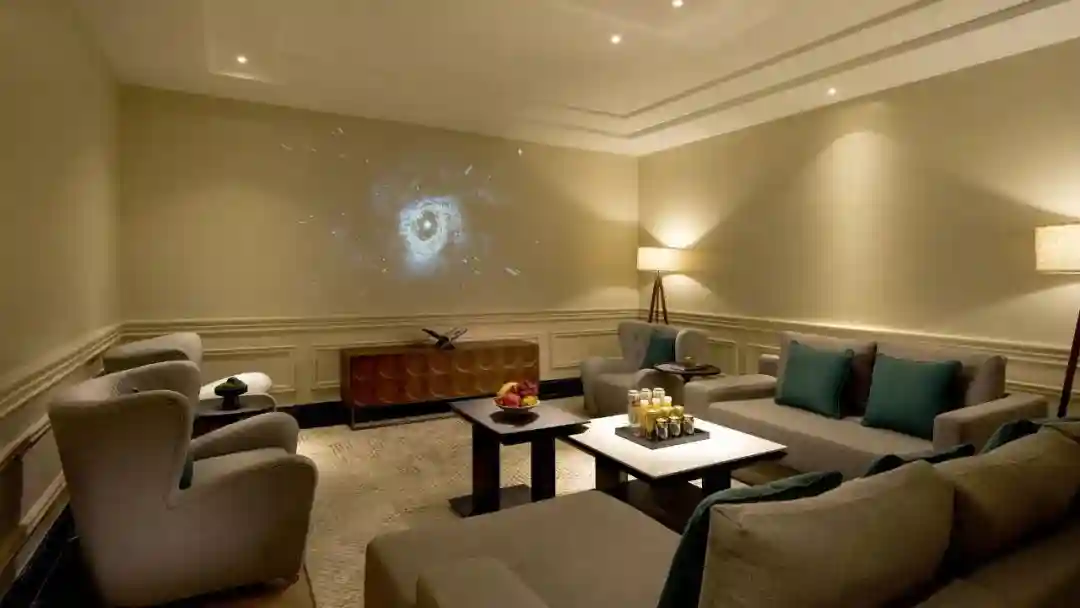 另外一种更加前卫,在客厅搭载了极米投影的至尊豪华影院套房,面积有135平米,非常适合小型聚会、看球或者结婚纪念等等。
