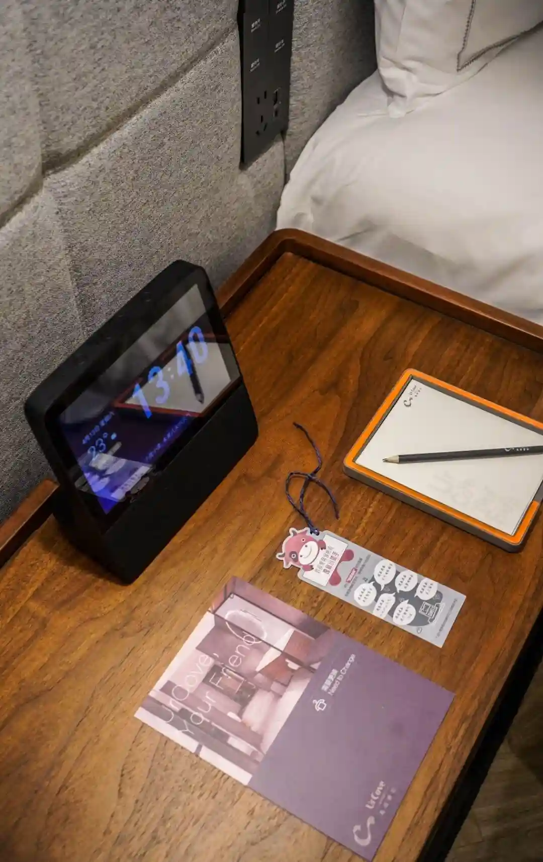 客房整体呈现出清浅的色调,标配新风系统。床头采用皮质包裹,在床头配置了智能蓝牙音响,值得一提的是,为了保证客人更好的休息,客房内并未配置电话,一切与前台的联系都可以通过床头的智能音响进行,同时房间内的窗帘、电视、空调等也可以语音操控。