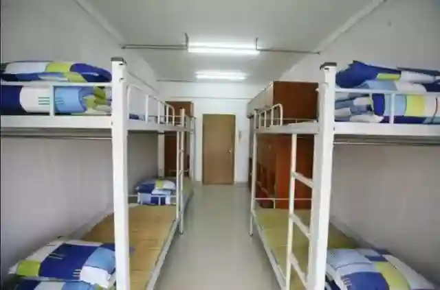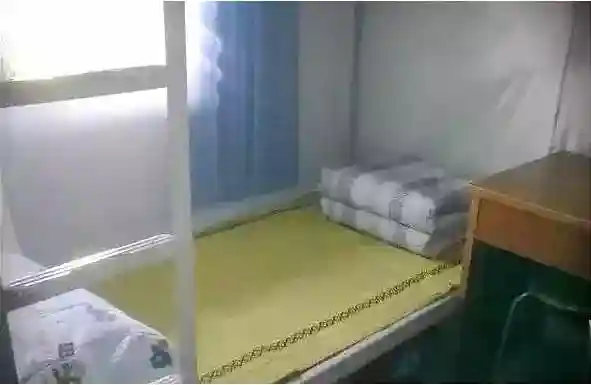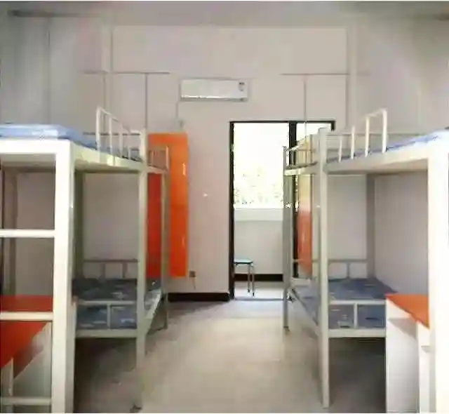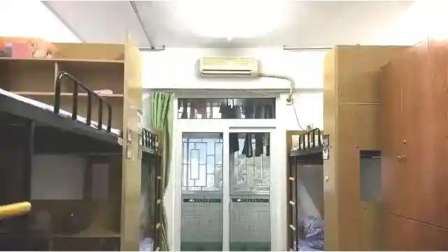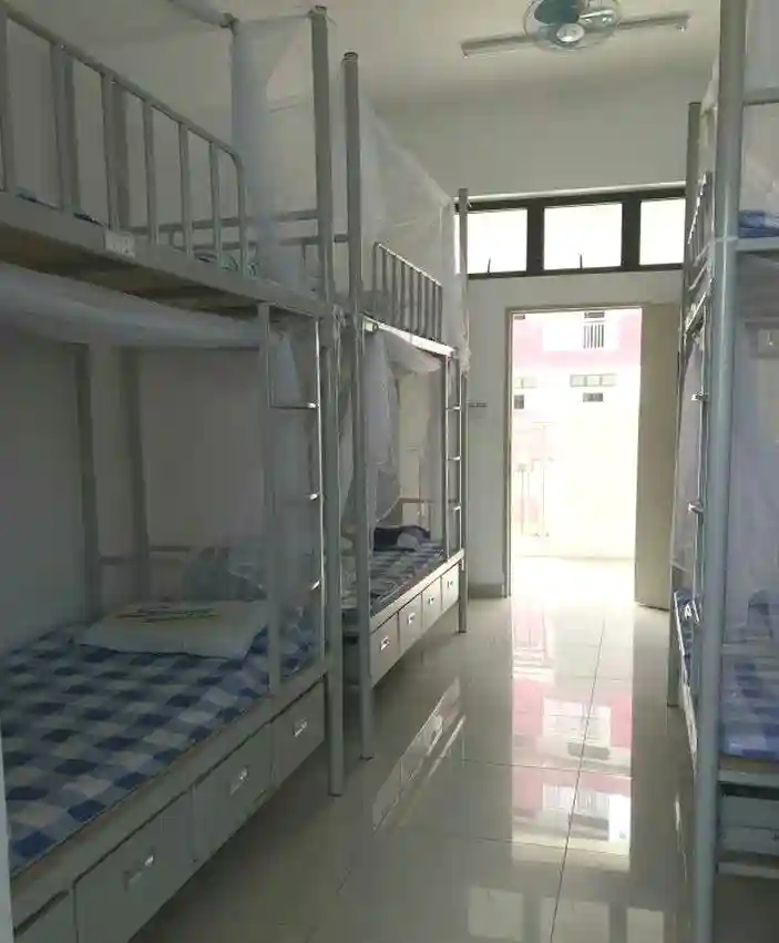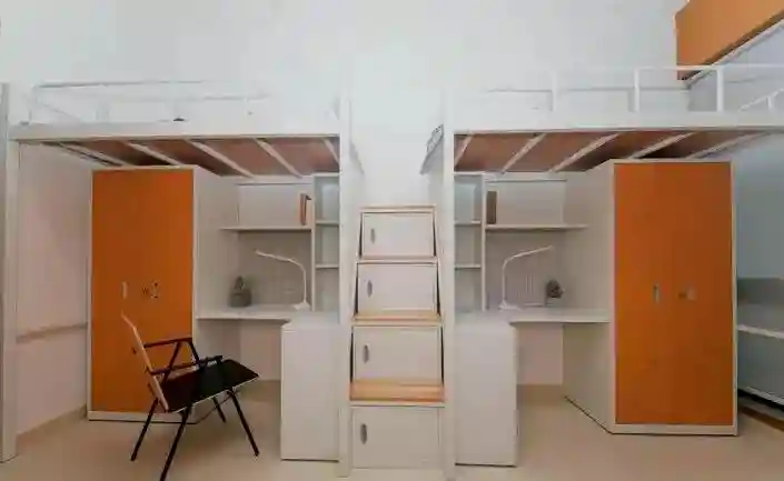 配置:3张上下铺铁床(自带床垫),一个落地式长柜,分四格。每间宿舍有独立卫生间、冲凉房,提供冷热水和空调。女生宿舍提供吹风机使用的插座。