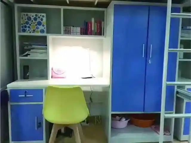 配置:床位上床下桌+一个三层书柜+一个三层鞋柜+双层落地柜(可自带锁)+抽屉。每间宿舍有冷暖空调+风扇+独立卫浴+洗手台。每栋宿舍楼有一件洗衣房:洗衣机+烘干机,各为3元/70分钟。宿舍床位:四张1.9+一张2.0。