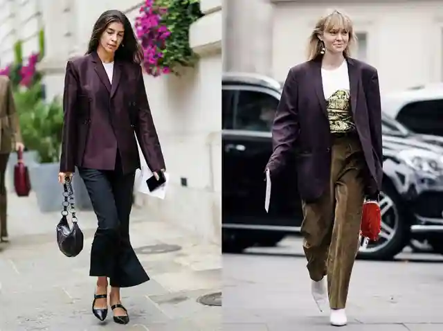 左图:将烘焙紫色西装搭配黑色喇叭裤,并且鞋子、包等配饰都是黑色,打造别致度。选择七分裤,露出脚踝,和白色针织内搭呼应,就可以消除沉闷感。