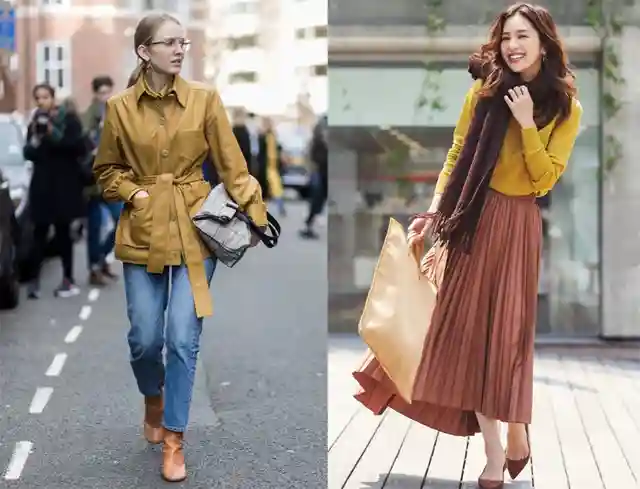 右图:纯色黄新鲜度太高,用烘焙“黄”会带来良好的印象。烘焙黄色针织衫,提亮脸部周围的区域。活泼的赤土色褶皱裙,增添了女性气质,用深棕色披肩搭配更聪明。