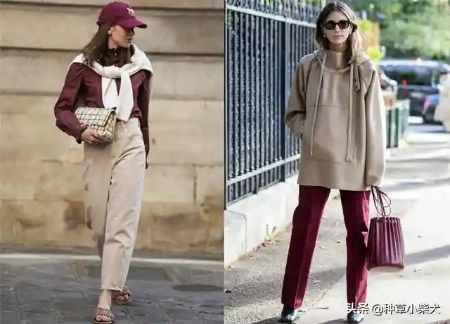 右图:可以在简单的上衣中看到烤红色裤子的魅力,米色和暗红色突显出了气质。选择中压裤和褶皱包,添加垂直效果,获得了良好的时尚感。
