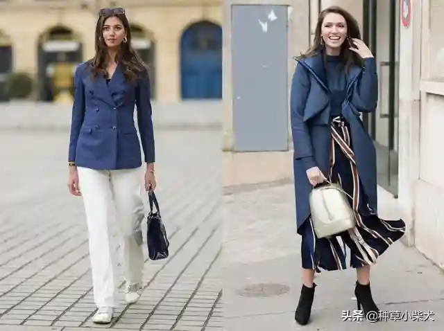 右图:以烤蓝色统一的上衣和外套,与海军蓝裙子相结合,营造出精致的色差感,并营造出深浅度的层次。有了条纹,就不必担心单调,香槟金包带来沉稳的配色方案。