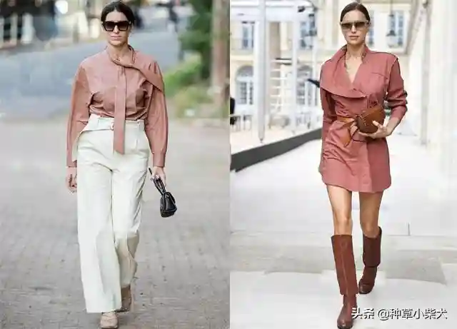左图:烤粉红色领结衬衫,与灰白色裤子营造出柔和的氛围,色彩的和谐被创造出来,并显得很优雅,散发着哑光的皮革般的上衣,给人一种“烘焙”的时尚感。
