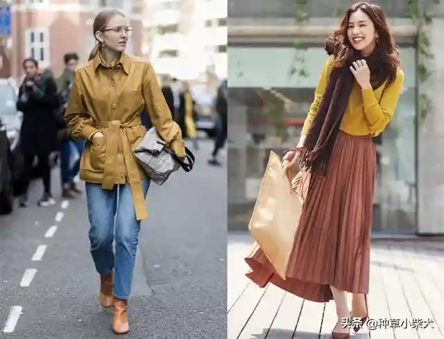 右图:纯色黄新鲜度太高,用烘焙“黄”会带来良好的印象。烘焙黄色针织衫,提亮脸部周围的区域。活泼的赤土色褶皱裙,增添了女性气质,用深棕色披肩搭配更聪明。
