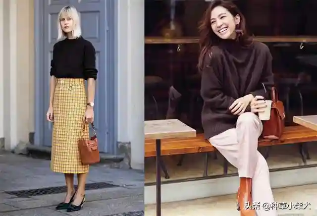 左图:烘焙棕色针织上衣和黄色格纹半身裙,通过保持干净的轮廓,包包也统一采用了同一种暖色系,有很好的凝聚力和时尚感。