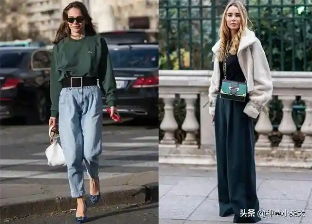 左图:卫衣套头衫和牛仔裤的轻松搭配,用别致的烘焙绿搭配,不会太随意。此外,用粗黑的腰带和带有装饰的蓝色高跟鞋加上适当的感觉,会成功地提高着装水平。