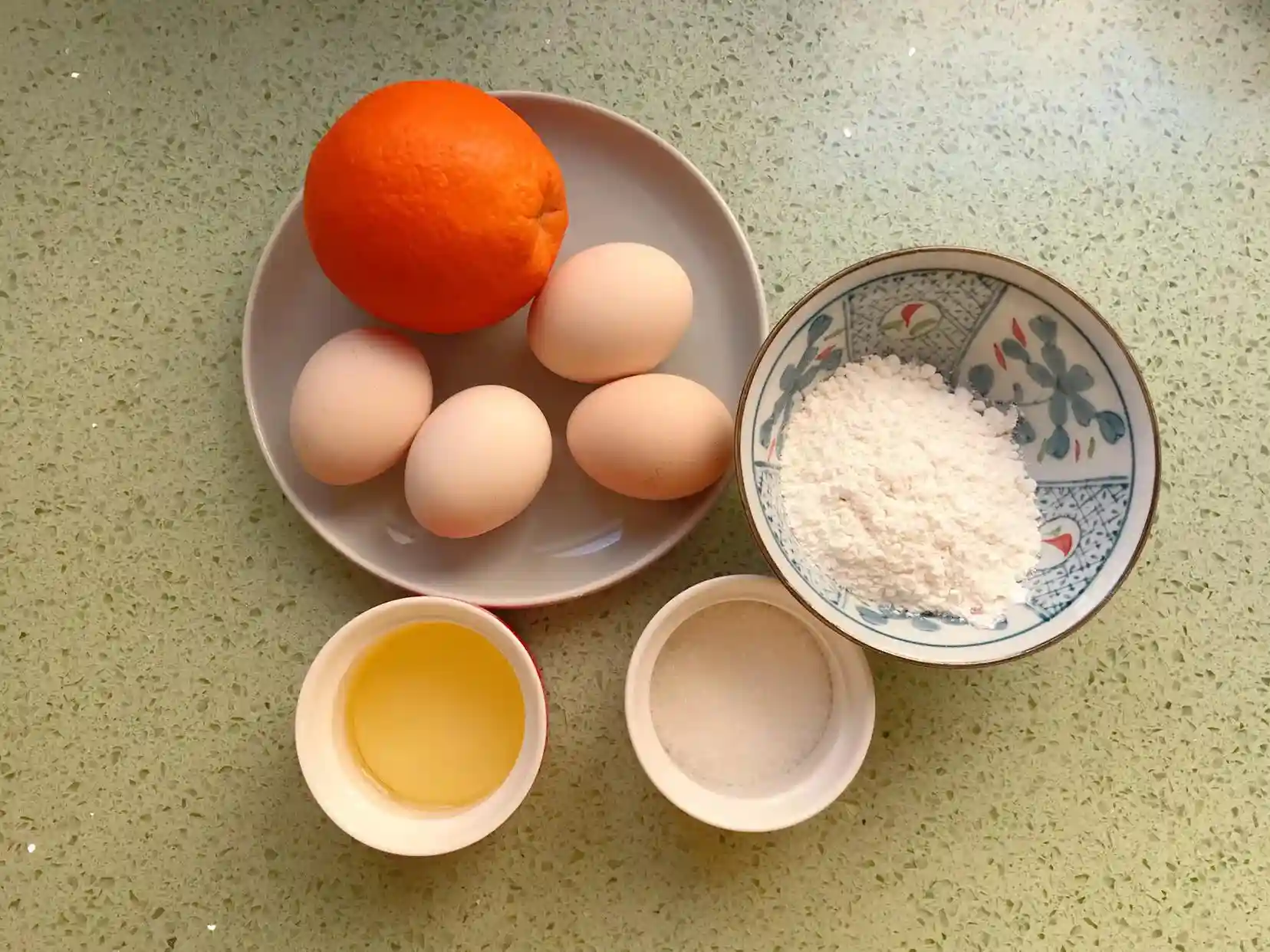 B:蛋黄糊部分:蛋黄4个、玉米油40克、低筋面粉50克、煮橙水45克(煮橙片剩下的水)