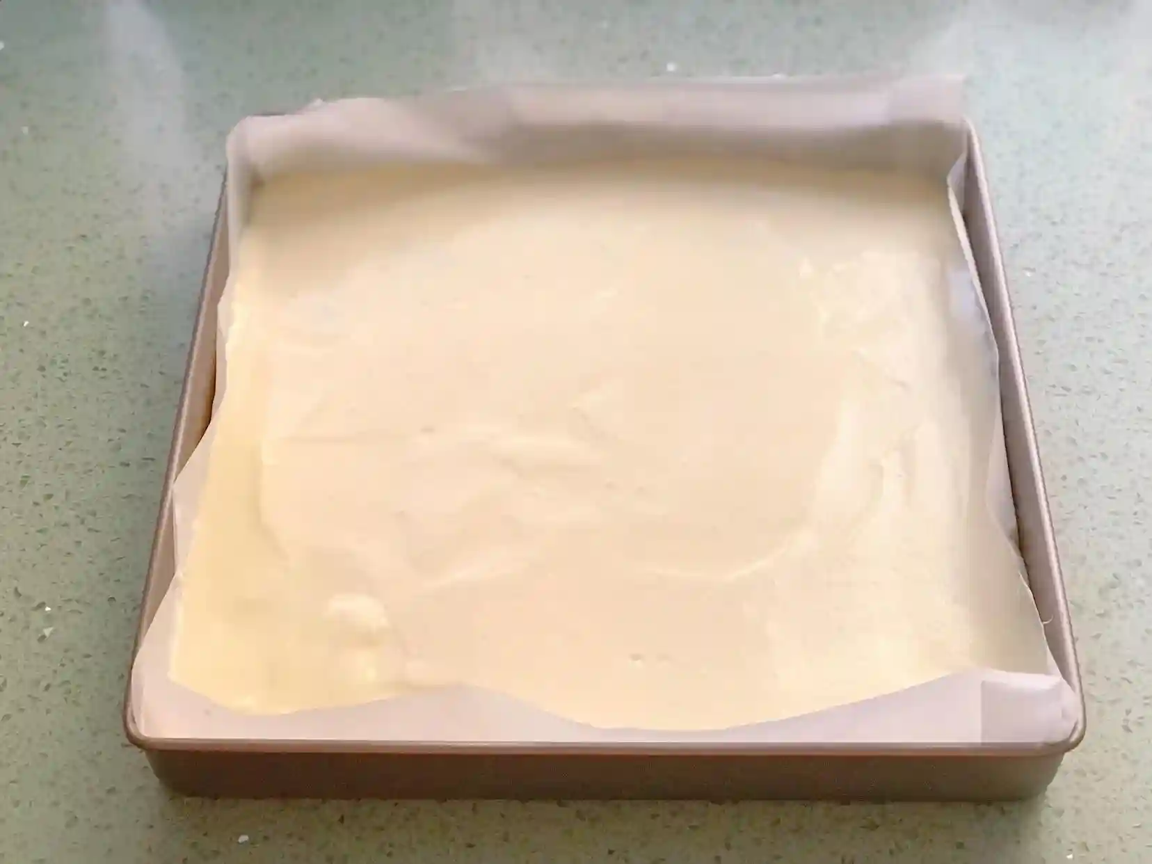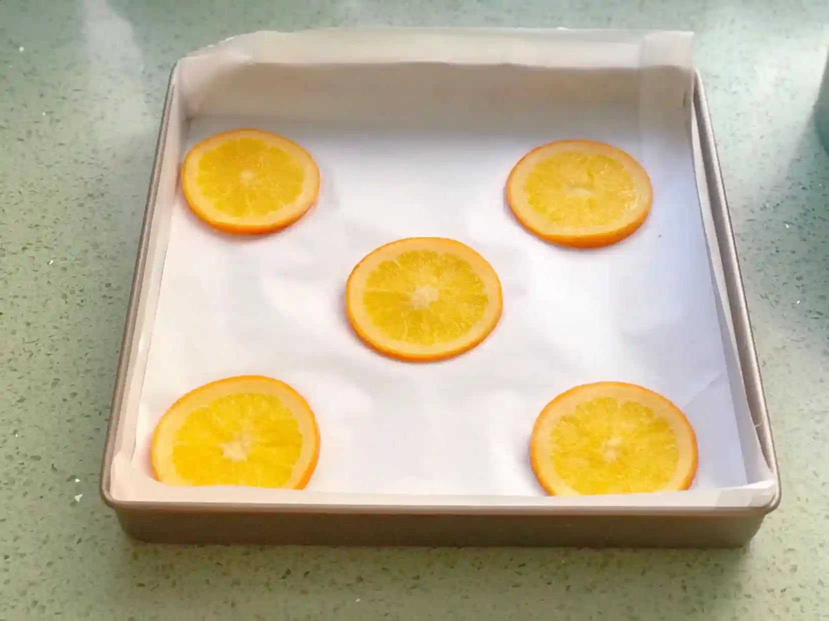 3、烤盘提前铺好油纸,在倒蛋糕糊之前将煮好的橙片摆在烤盘上,具体的摆法就是四个角摆一片,最后中间再摆一片即可,将拌好的蛋糕糊从高处倒入烤盘中,用刮板将表面刮平,轻震几下震出大气泡。