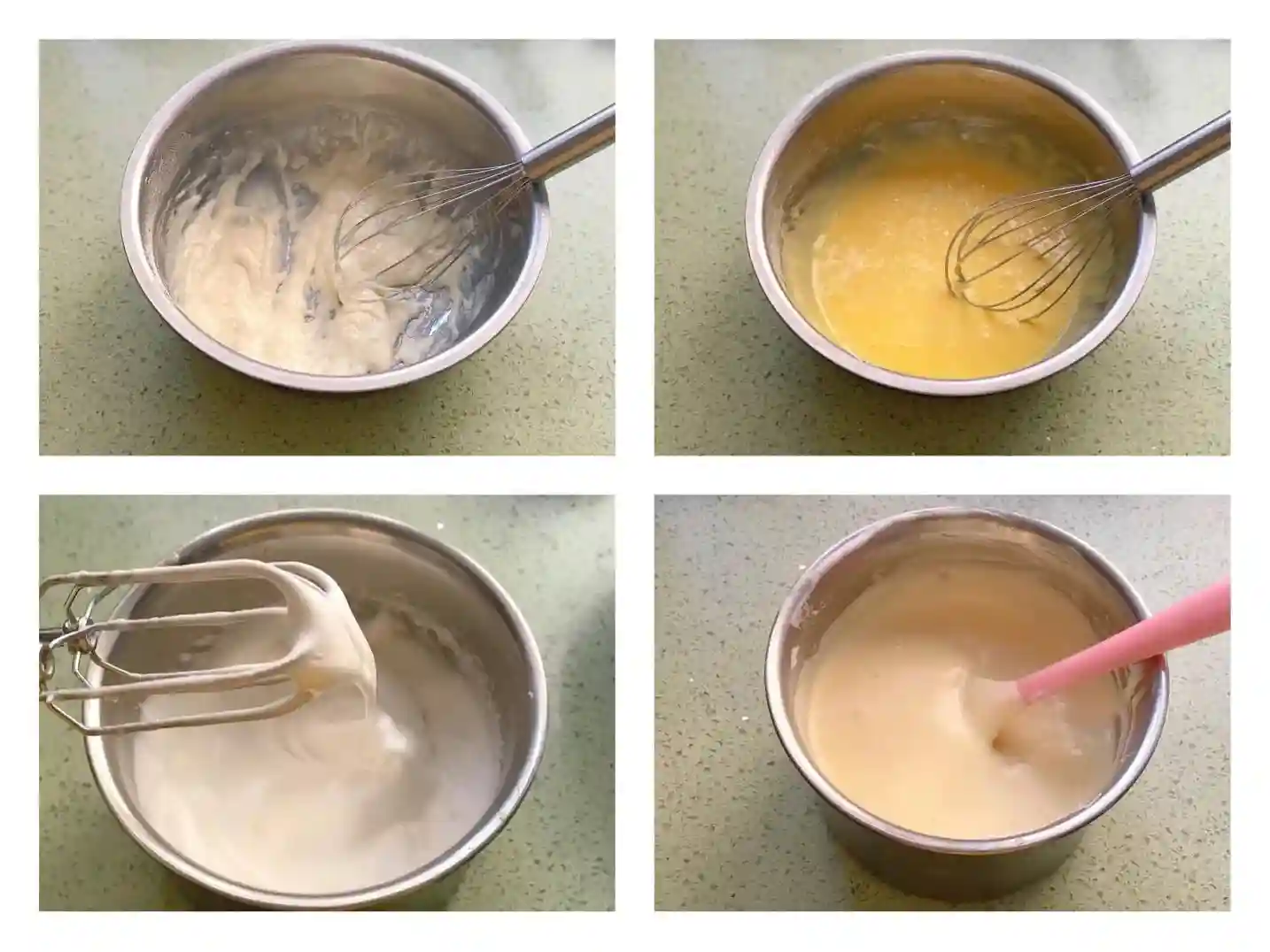 蛋黄面糊制作也有注意事项,一是要用低筋面粉,实在没有可以用等量的玉米淀粉代替部分面粉,再一个就是拌面糊的时间不宜过长,以免破坏蛋糊中的气泡,影响蛋糕的口感和品质,最后面糊的翻拌手法一定要注意不要打圈搅拌,避免面糊“起劲”。