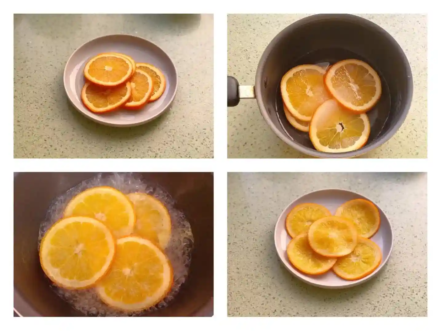 1、买回来的香橙使用盐搓洗干净,一定要使用盐仔细搓一搓表面,这样可以除去橙子皮的苦味和表皮的蜡质,橙子清洗干净后切成约半公分后的橙片,将切好的橙片放进锅中,加入130克的水和15克的砂糖,上火煮至橙片四周透明捞出沥水备用,煮橙片的水不要倒掉,后面还要用。这里需要注意的是在煮橙片的时候一定要使用小火,慢慢煮至边缘变成透明色。切片的时候不要切的太厚,太厚卷蛋糕的时候会影响美观。