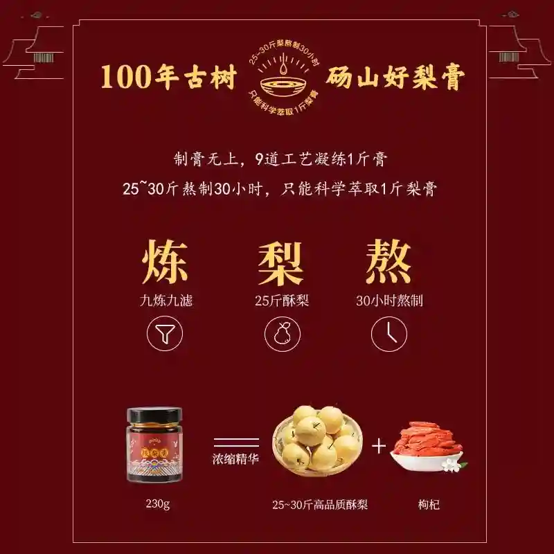 挑选砀山黄河故道带种植区的精品酥梨,含有更丰富的矿物质、有机酸和维生素;25-30斤才能熬出1斤的梨膏,九炼九滤,低温精工慢熬。