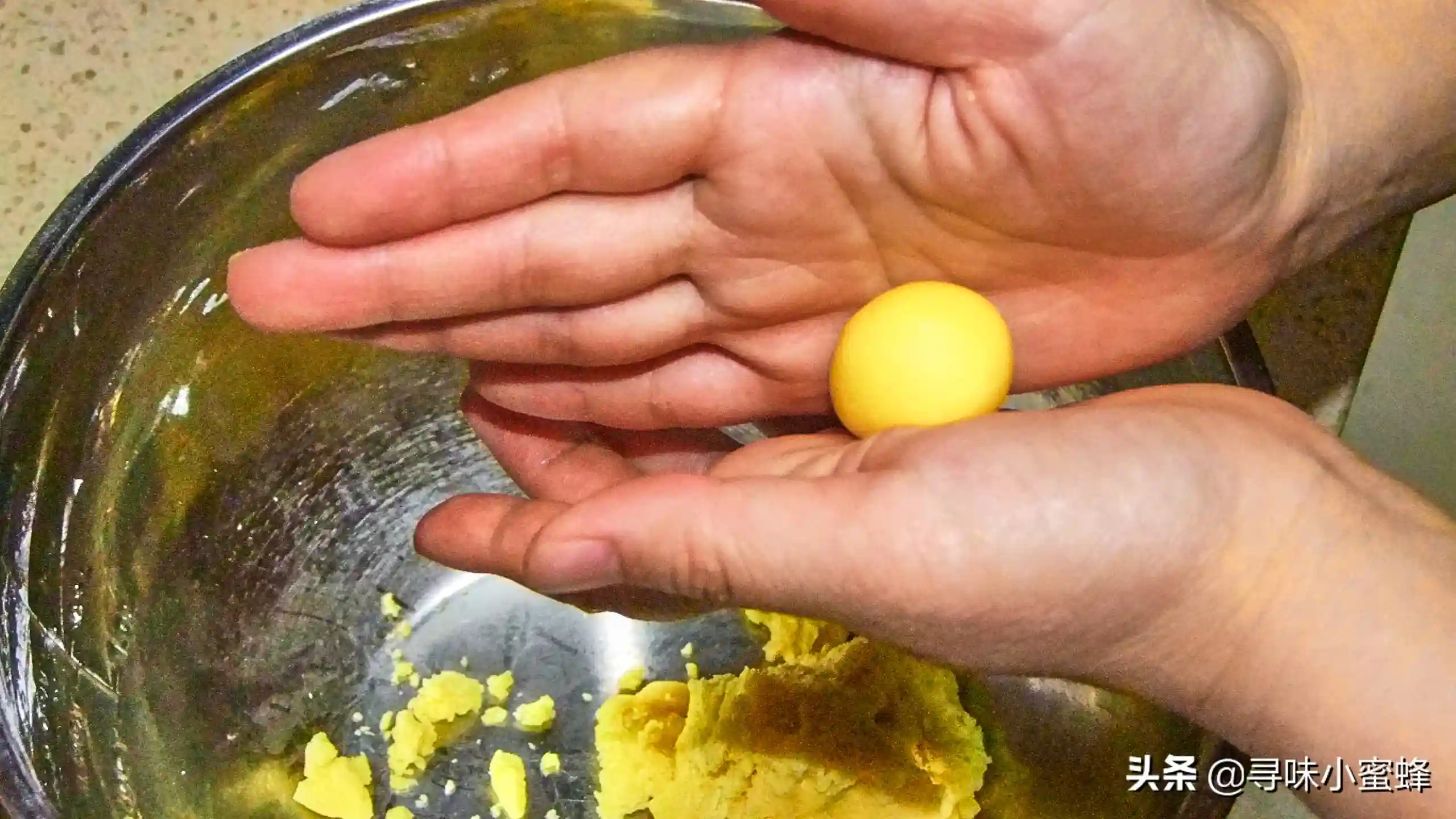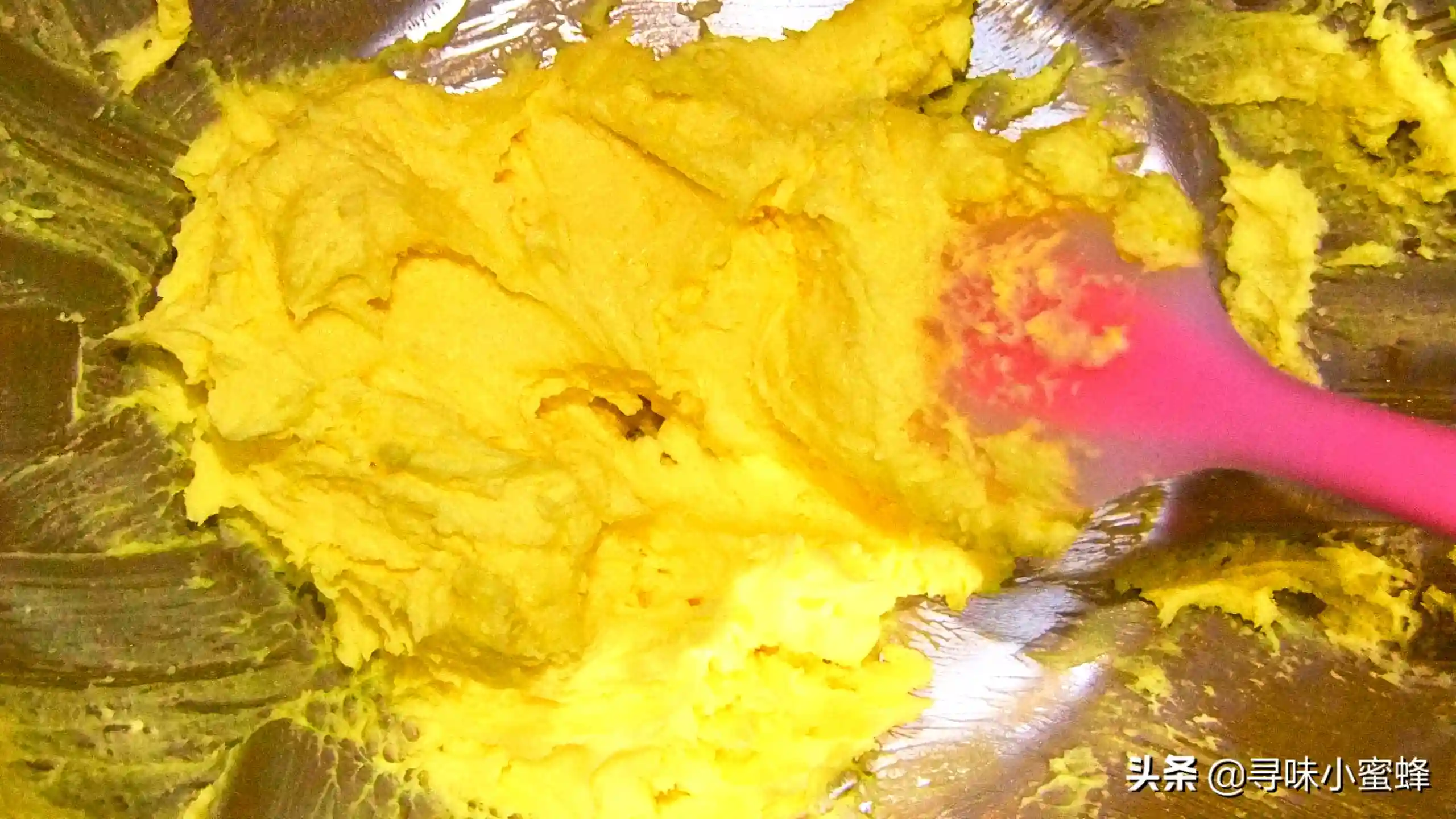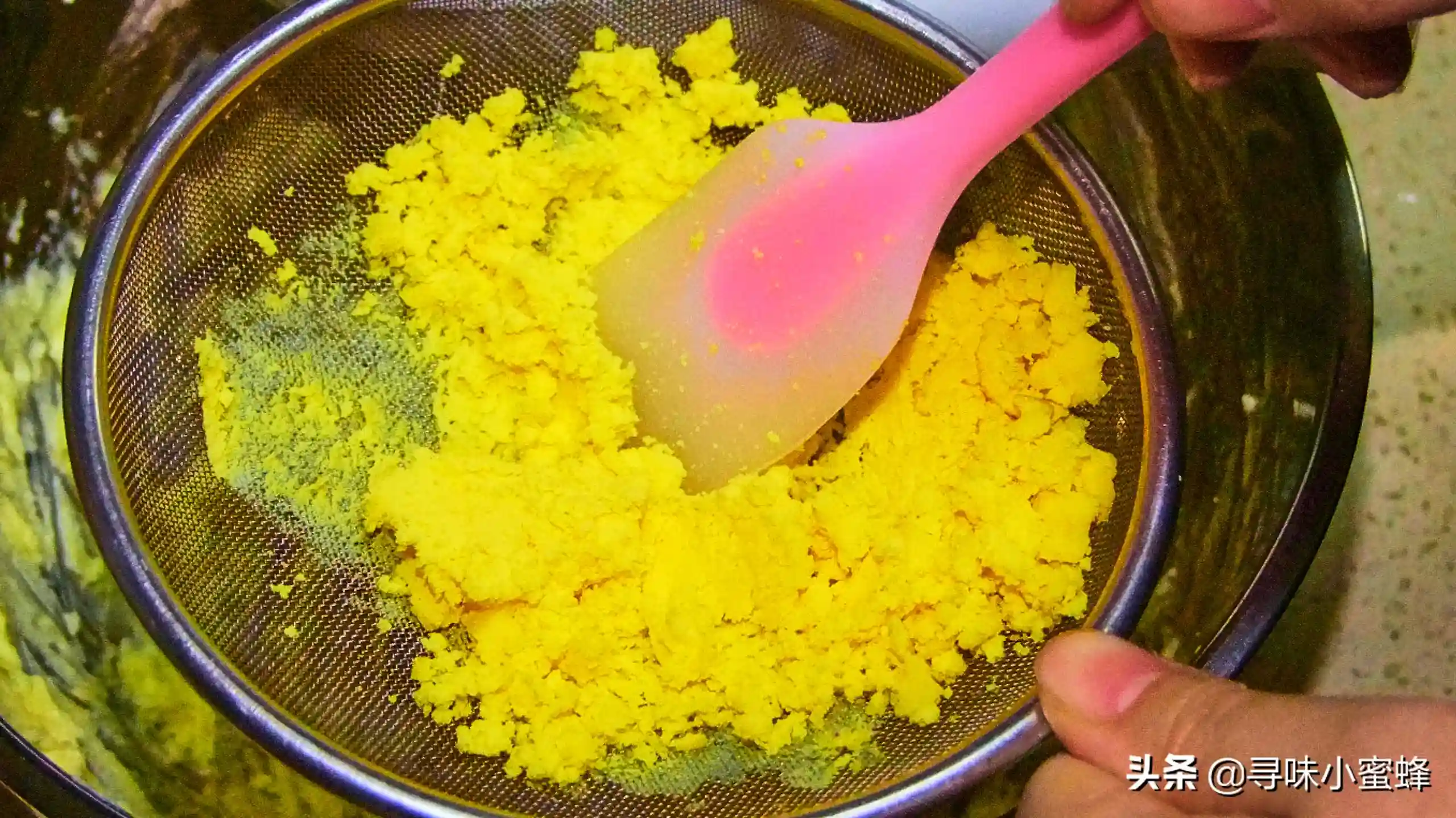 5.蛋黄过筛需要有耐心,蛋黄最好是刚煮熟的,如果放的时间太长蛋黄表面比较干,按压的时候比较费力气。