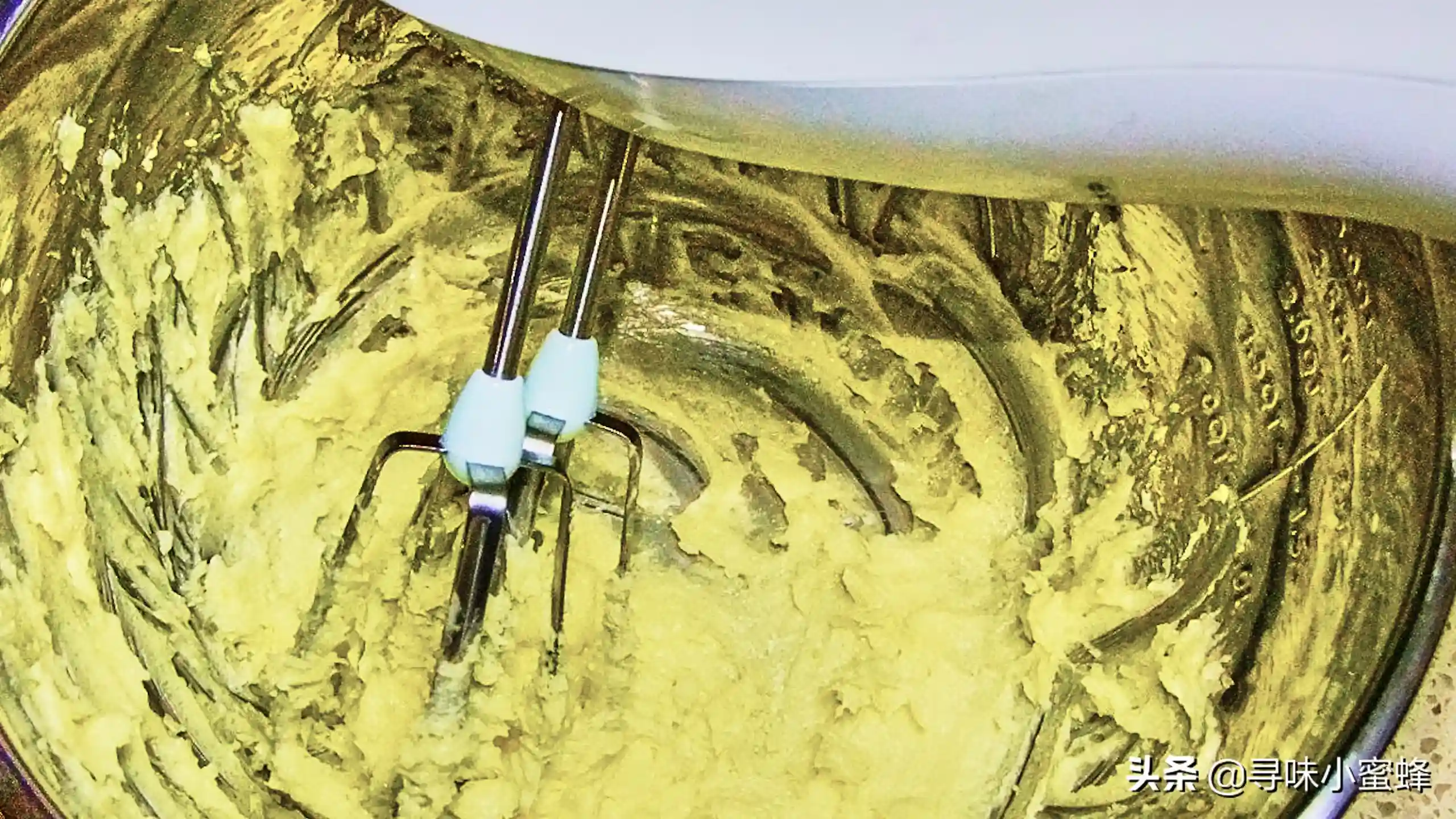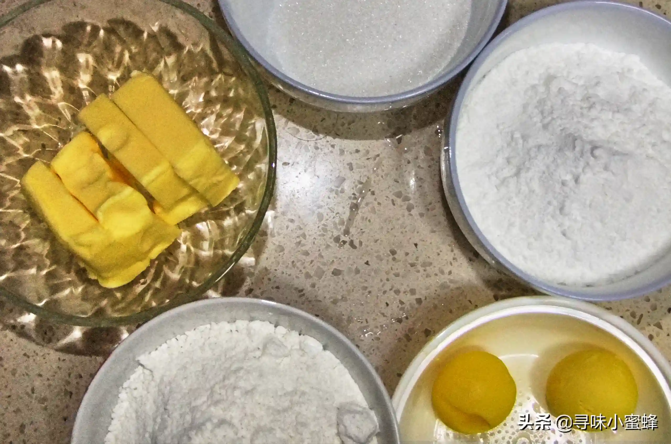 2.黄油需要提前软化,如果觉得时间太长,可以把装黄油的容器放在温水里隔水加热,水温不能太高,否则黄油会化成液体了,没有办法打发了。
