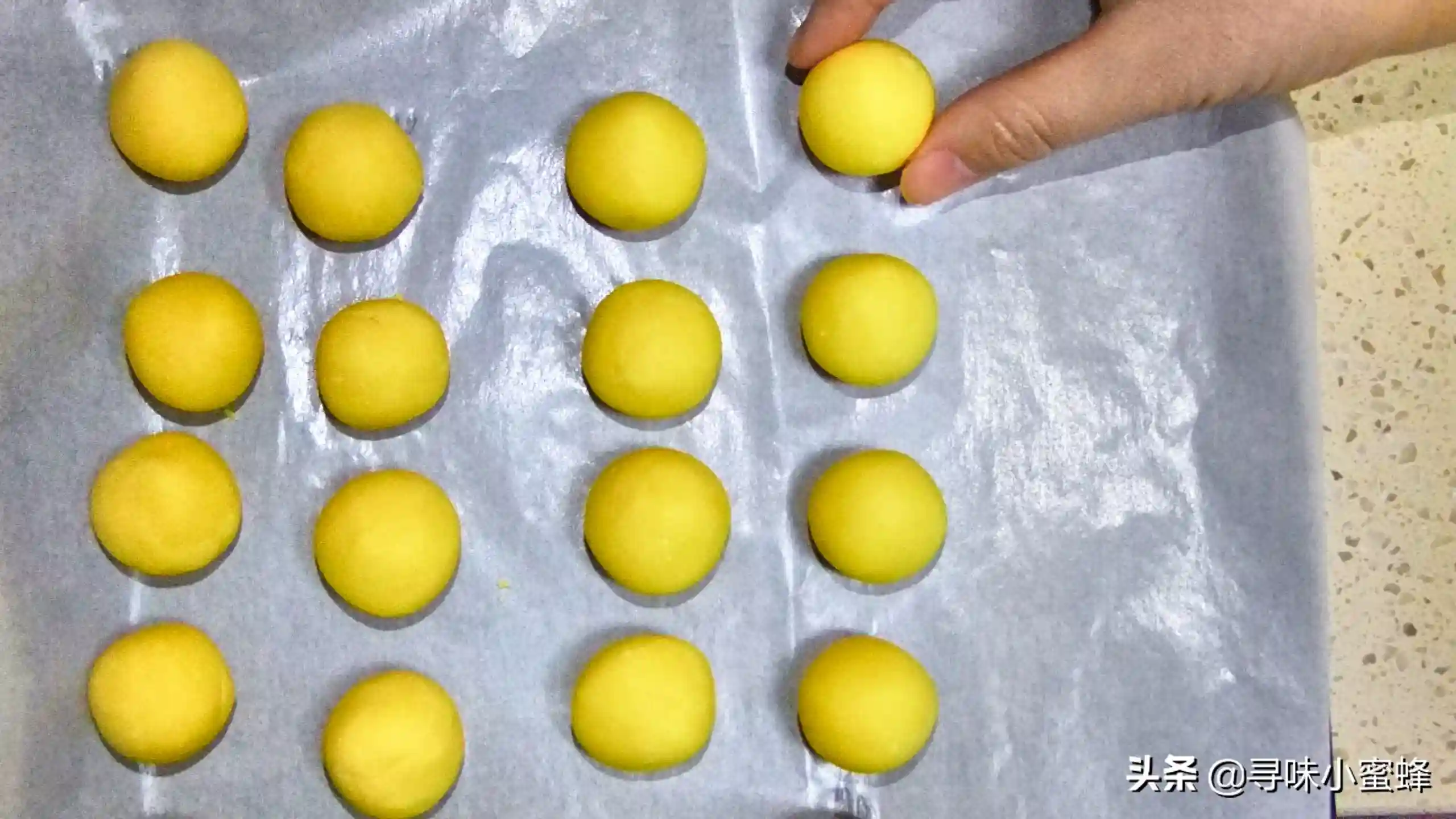 8、取一小块面团揉成球状,放在铺好的油纸上待用。重复此操作。