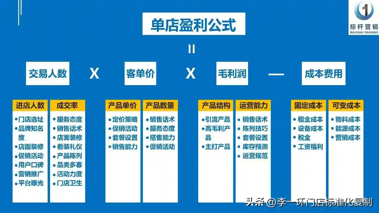 李一环认为连锁企业每一位管理者,都要懂门店标准化复制,同时连锁品牌更应该建立:连锁门店运营管理手册,门店标准化复制,店长标准化复制,门店销售标准化手册,门店销售话术手册,门店百问百答话术,标杆销售经验萃取复制,督导标准化体系,以及连锁总部门店人才训练体系。