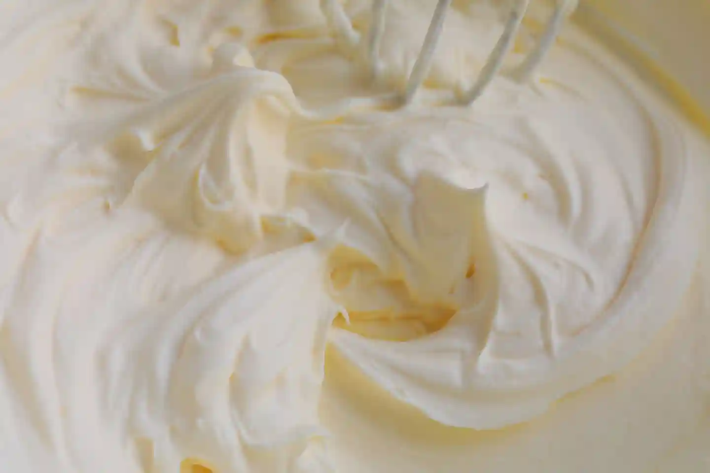 加入细砂糖高速打发,动物奶油乳脂含量高(35.7%),入口香浓,口感醇厚,打发到八九分发状态也可以稳定细腻,裱花花纹也可以保持的很好。