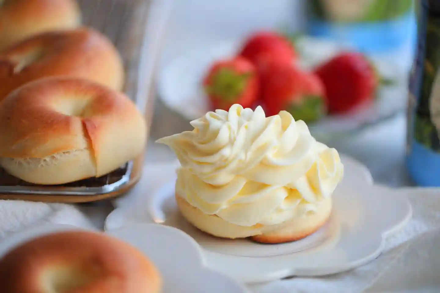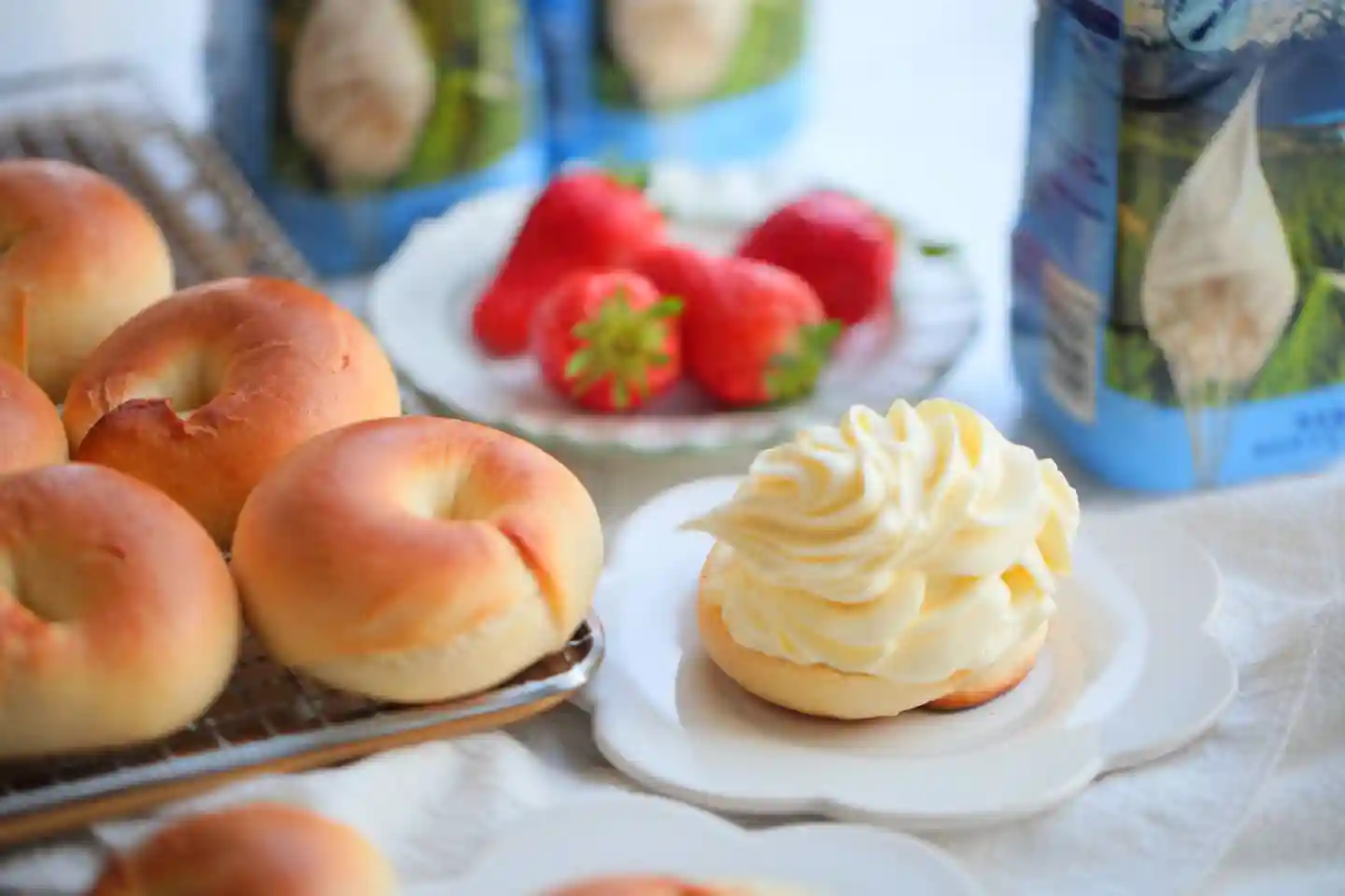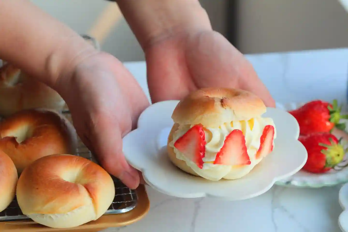 6、装饰:贝果从中间切开,挤入厚厚的奶油,多挤一些效果才好哦,表面贴适量草莓切片提升口感。