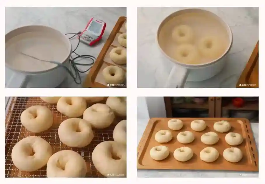 3、煮糖水,水加入细砂糖,煮到80度,煮糖水可以让贝果表面上色,口感更加Q弹,每一面烫25秒就可以啦,注意不要烫到手哦~捞出放到网架沥干转移到烤盘上。