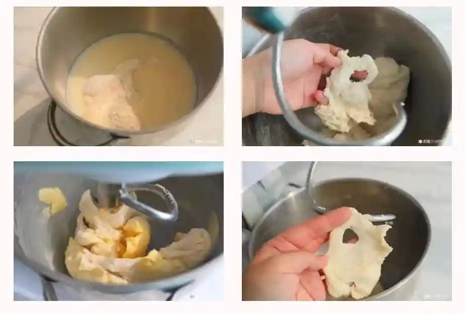 制作方法1、贝果揉面,贝果的面团是比较偏硬的哈,可以在成团前根据面团吸水性调节下牛奶含量,揉到稍微厚膜了加入软化的黄油,继续揉到微微锯齿状就行,面温控制在26度。
