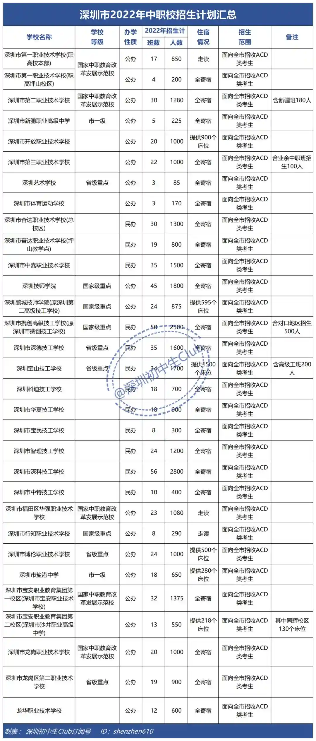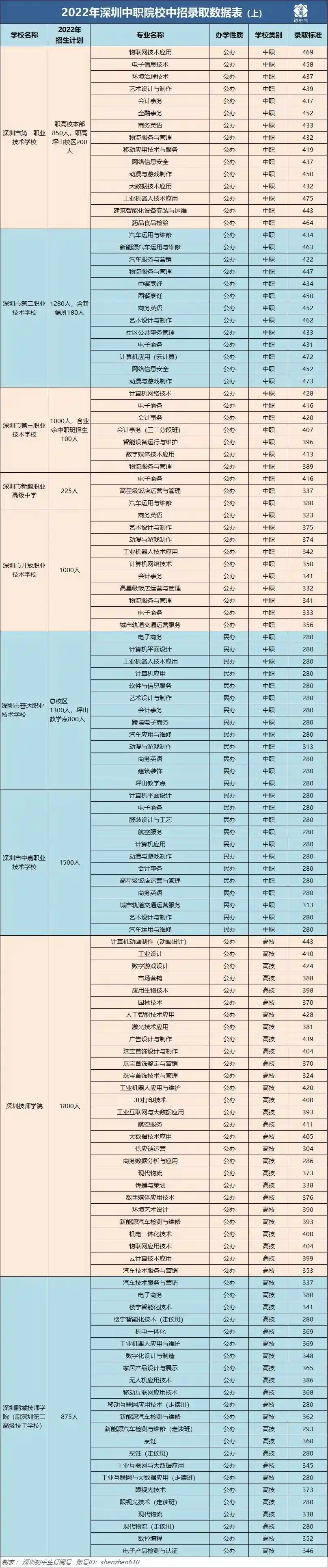 深圳中职校情况2022深圳共27所中职学校招生,其中,民办中职11所、公办中职16所,共招生30630人。在深圳,公办中职院校一般都是免学费的,民办中职会根据专业情况进行收费,一般都在1万/学期以内,相较于民办普高,还是有较大差距的。