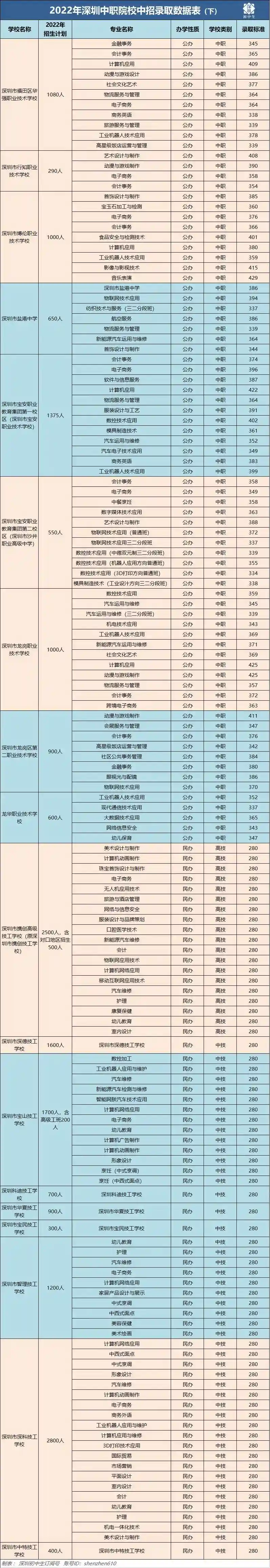 中考录取分数线下表为2022年深圳中职、中技、高技分数线汇总表。可以看到各中职校的分数线从280分横跨到475分,区间跨度较大,部分校的专业录取线比非深户公办普高线还要高出十几分,足见这些中职校专业的热门程度。所以,大家不妨去细致了解一下中职校,也许会有不一样的收获。