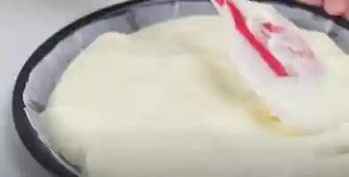 ④取出三分之一的蛋白霜放进蛋黄糊搅匀,搅匀后倒进剩下的蛋白霜里,将其搅匀,然后把做好的蛋糕糊倒进烤盘抹匀,放进预热好的烤箱里。烤箱设置:上下火选择170度,时间选择半小时。