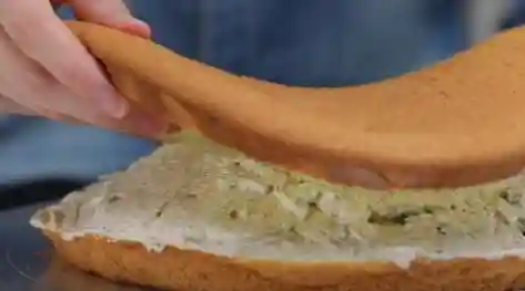 ②取一半红茶奶油抹匀在蛋糕上,再放上珍珠,均匀抹上剩下的淡奶油,盖上另一份蛋糕片,这样就做好啦。