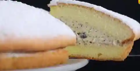 ⑤蛋糕烤好后取出放凉然后切成两半。