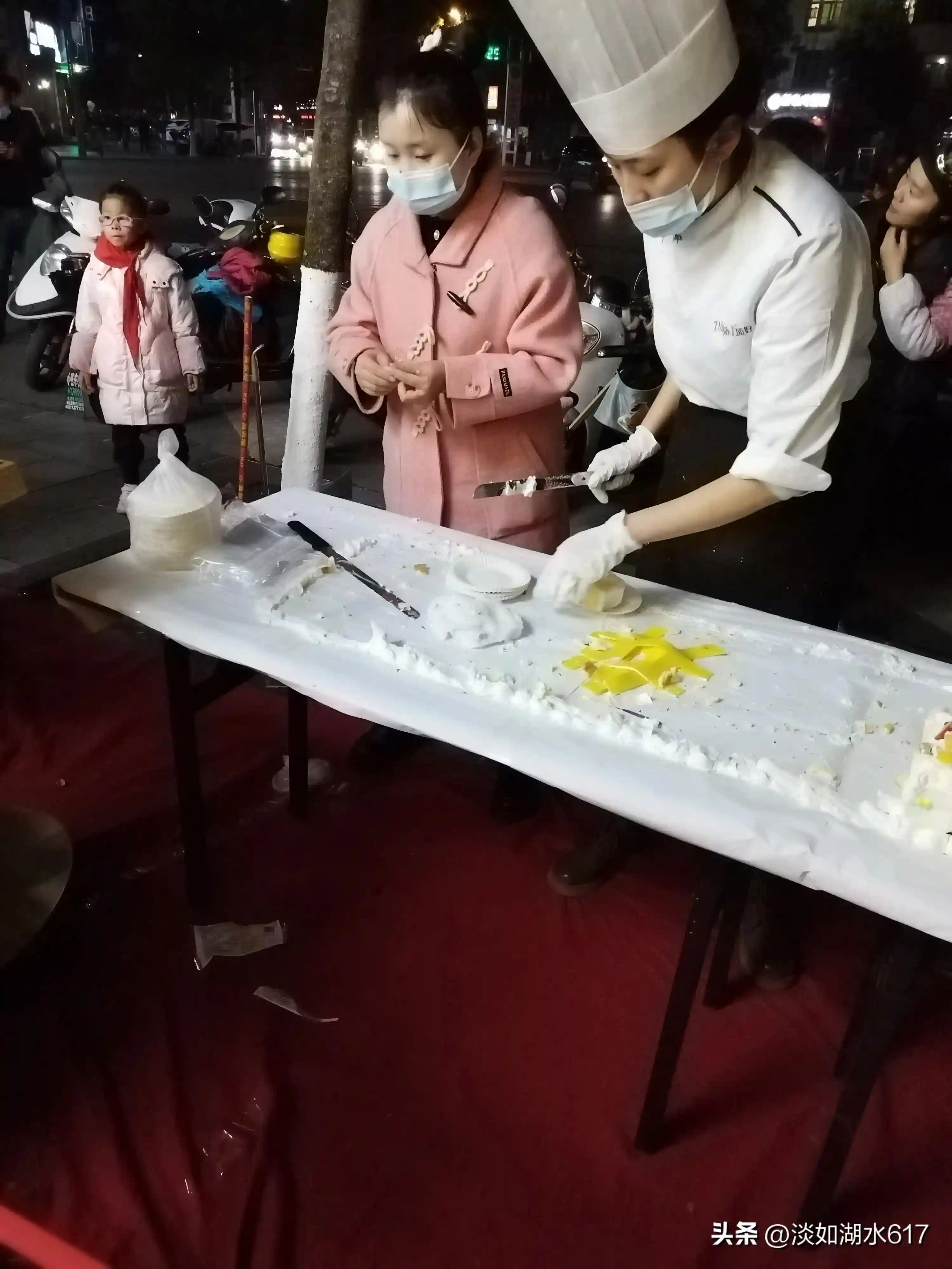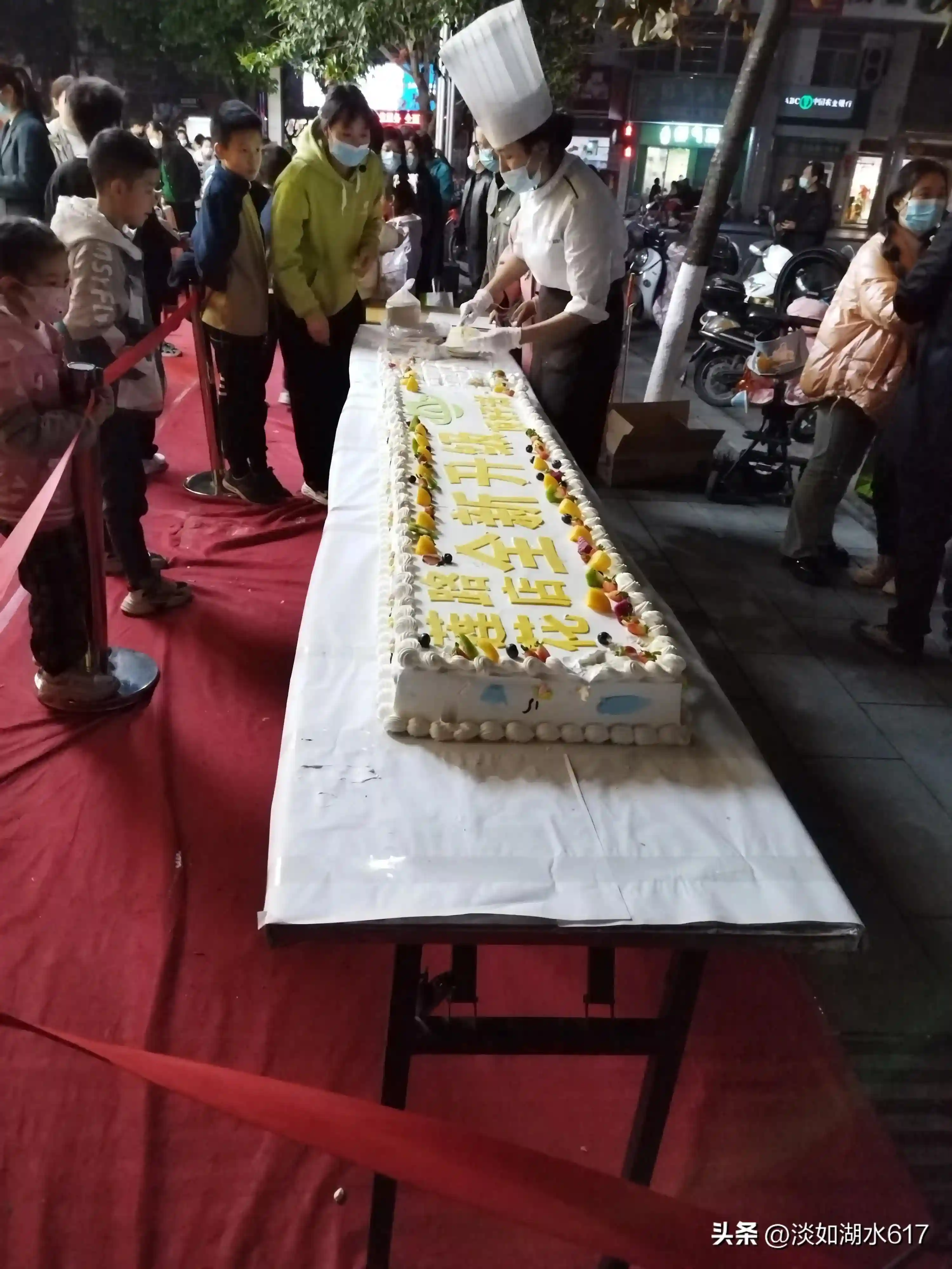 好家伙,蛋糕师傅现场做了一个长长的大蛋糕,正在提供免费品尝服务,排队拿取,现场现吃现切,每人都可以享用到一碟拳头那么大块蛋糕。