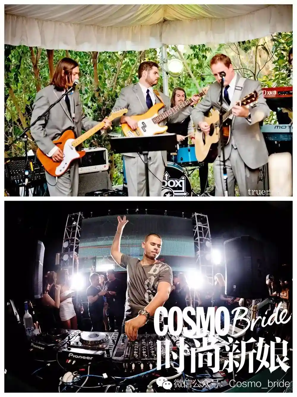 DJ可以配合婚礼气氛变换各种音乐,制造电子混音的效果,比乐队更具有灵活性,比既定曲目的播放更加立体。如果安排了AfterParty,邀请DJ点燃舞池绝对是非常棒的选择。你需要邀请一位可以读懂来宾情绪的DJ,让打碟表演与婚礼气氛更加融洽。